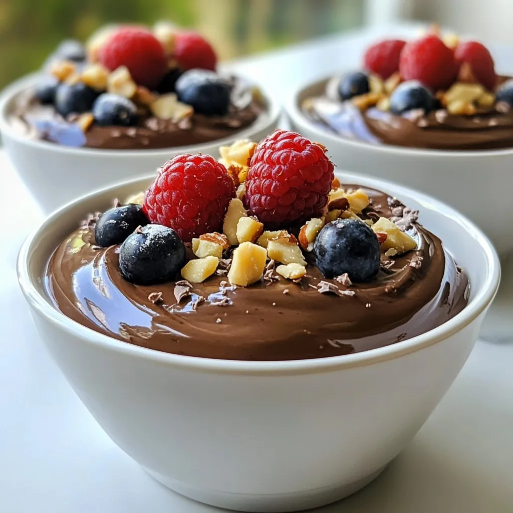 - 2 ripe avocados - 1/4 cup unsweetened cocoa powder - 1/4 cup maple syrup or honey - 1/4 cup almond milk or your favorite plant-based milk - 1 teaspoon pure vanilla extract - 1/4 teaspoon sea salt To make avocado chocolate pudding, you need just a few key ingredients. Ripe avocados are crucial. They give the pudding its smooth and creamy texture. Unsweetened cocoa powder adds rich chocolate flavor without extra sugar. You can sweeten the pudding with maple syrup or honey. Maple syrup is vegan, while honey is not. Almond milk makes the pudding light and keeps it plant-based. If you want, feel free to use any milk you like. A splash of pure vanilla extract adds warmth. Finally, a pinch of sea salt enhances all the flavors. - Fresh berries (like strawberries or raspberries) - Chopped nuts (such as walnuts or pecans) - Coconut flakes For toppings, fresh berries add a pop of color and a burst of taste. Chopped nuts give a nice crunch. If you like coconut, sprinkle some flakes on top for extra flavor. {{ingredient_image_2}} - Halve and pit the avocados. - Scoop flesh into a blender or food processor. First, take two ripe avocados and cut them in half. Use a spoon or knife to remove the pit safely. Then, scoop the creamy green flesh into your blender or food processor. This is the base of your pudding. - Add cocoa powder, sweetener, almond milk, vanilla extract, and sea salt. - Blend until smooth and creamy. Next, pour in 1/4 cup of unsweetened cocoa powder, 1/4 cup of maple syrup (or honey), and 1/4 cup of almond milk. Add 1 teaspoon of pure vanilla extract and a pinch of 1/4 teaspoon sea salt. Blend everything on high speed. Scrape down the sides if needed. You want a smooth and creamy mix. - Taste and adjust sweetness with additional maple syrup if desired. - Blend briefly to combine. Now, taste your pudding. If you want it sweeter, add a little more maple syrup. Blend briefly to mix it in well. This step ensures the pudding matches your taste. - Transfer pudding to serving bowls. - Chill in refrigerator for at least 30 minutes. Finally, use a spatula to scoop the pudding into serving bowls. Chill them in the fridge for at least 30 minutes. This waiting time helps the flavors mix and the pudding to set. Enjoy the rich, chocolatey goodness! To make avocado chocolate pudding creamy, choose ripe avocados. Ripe avocados are soft yet firm. They blend easily and add a rich texture. If the avocados are too hard, the pudding will be lumpy. Always check for ripeness by gently squeezing them. If they yield slightly, they are ready. To prevent lumps, blend the pudding well. Use a high-speed blender to achieve a smooth mixture. Stop to scrape down the sides with a spatula. Blend again until everything is fully mixed. This ensures a silky texture that melts in your mouth. Serving this pudding in clear glass dishes makes it look fancy. You can see the rich brown color, which looks appetizing. Use small bowls or ramekins to give individual servings. This way, each person can enjoy their own portion. For garnishing, get creative! Top with fresh berries like strawberries or raspberries for color. You can also sprinkle chopped nuts on top for a crunch. Adding coconut flakes gives an exotic feel. A mint leaf adds a touch of freshness. This not only enhances flavor but makes it visually appealing. You can make this pudding your own by trying different sweeteners. Maple syrup is great, but honey works too. If you want to keep it vegan, stick with maple syrup. You can also use agave nectar for a milder taste. Adding spices can change the flavor profile. A pinch of cinnamon or nutmeg adds warmth and depth. These spices pair well with chocolate, giving a unique twist. Don't be afraid to experiment! Pro Tips Choose Ripe Avocados: Make sure your avocados are perfectly ripe for the creamiest texture. They should yield slightly to gentle pressure when squeezed. Customize Sweetness: Adjust the sweetness by starting with less maple syrup or honey, then add more according to your taste preference after blending. Chill Thoroughly: Allow the pudding to chill for at least 30 minutes to enhance the flavors and achieve the right consistency. Experiment with Toppings: Get creative with toppings! Fresh fruit, nuts, or even a drizzle of nut butter can elevate each serving into a unique treat. {{image_4}} You can change the taste of your avocado chocolate pudding by using different sweeteners. Here are two great options: - Agave nectar: This sweetener is light and has a mild flavor. It mixes well into the pudding. Use it in the same amount as maple syrup for a sweet touch. - Coconut sugar: This option adds a hint of caramel flavor. It has a lower glycemic index than regular sugar. Swap it for maple syrup in equal parts for a unique taste. These options give you the freedom to customize your pudding based on your taste and diet. If you want to keep this pudding dairy-free, there are easy swaps: - Using different plant-based milks: Almond milk is great, but you can use oat, soy, or cashew milk too. Each brings its own flavor to the pudding. - Adding dairy-free toppings: Fresh fruits and nuts are great toppings. You can also use coconut whipped cream for a creamy finish. This keeps the dessert light and fun. Try these alternatives to make your pudding fit your diet while still being delicious. Want to change things up? Adding different flavors is an easy way to do it: - Adding coffee or espresso for a mocha twist: A hint of coffee will deepen the chocolate flavor. Just mix in one teaspoon of instant coffee or espresso powder when blending the pudding. - Incorporating nut butters for richness: Peanut or almond butter adds creaminess. Stir in a tablespoon for a nutty flavor that pairs well with chocolate. These flavor variations keep your dessert exciting, making each bite a new experience. Store leftover avocado chocolate pudding in an airtight container. Glass or plastic containers work well. This keeps the pudding fresh and prevent