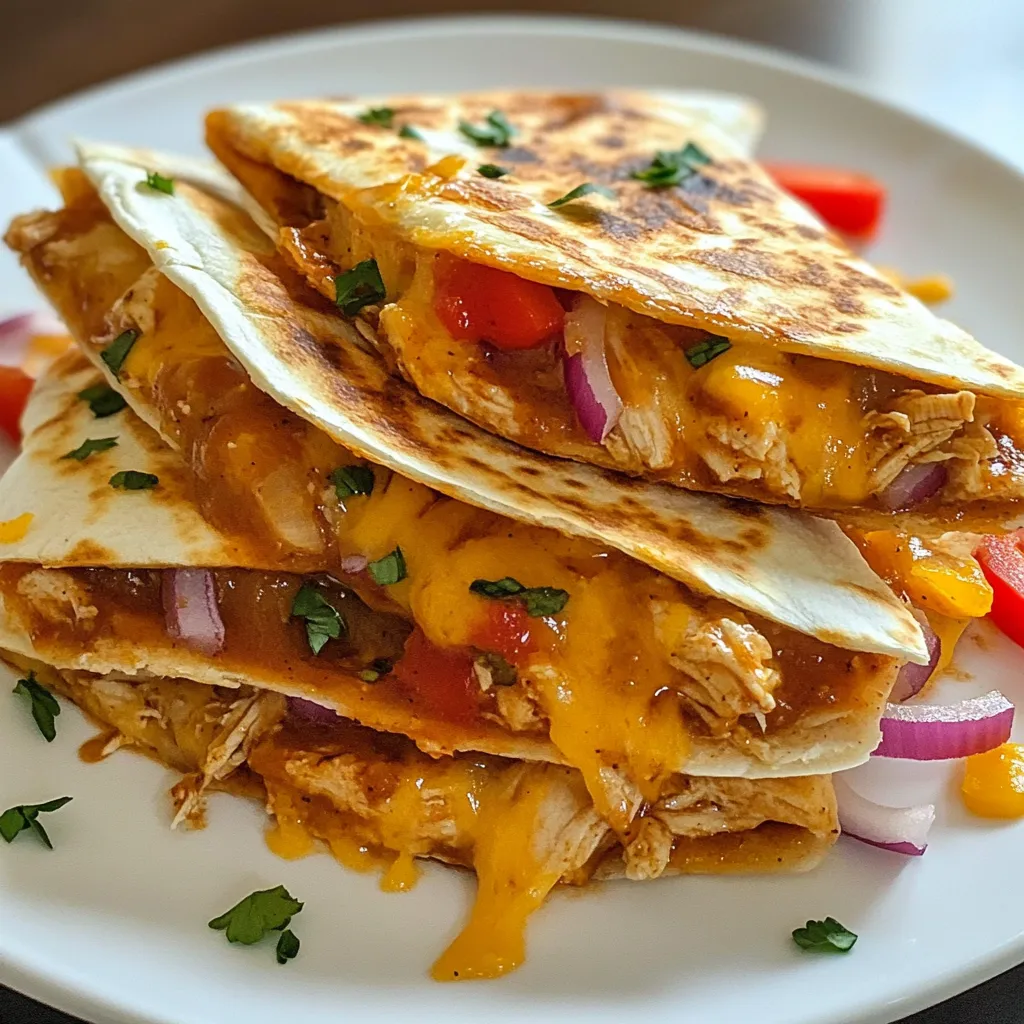 To make BBQ Ranch Chicken Quesadillas, you need fresh and tasty ingredients. Here’s what you need: - 2 cups of shredded cooked chicken - 1 cup of your favorite BBQ sauce - 1/2 cup of creamy ranch dressing - 1 cup of shredded cheddar cheese - 1 cup of shredded mozzarella cheese - 1 medium red onion, thinly sliced - 1 bell pepper (red or green), thinly sliced - 8 large flour tortillas - Olive oil for grilling - Optional garnish: fresh cilantro, chopped Each ingredient plays a key role in your quesadilla's flavor. The shredded chicken absorbs the BBQ sauce and ranch dressing. The cheeses melt beautifully, adding creaminess. The onions and bell peppers add a fresh crunch. Use your favorite BBQ sauce to make it just right for your taste. Enjoy mixing these to create a delightful dish! {{ingredient_image_2}} - First, grab a large bowl. Add 2 cups of shredded cooked chicken. - Pour in 1 cup of BBQ sauce. Use your favorite type. - Add 1/2 cup of creamy ranch dressing. Stir the mix well. - Next, slice 1 medium red onion thinly. - Then, slice 1 bell pepper, red or green, also thinly. - Heat a non-stick skillet over medium heat. Drizzle some olive oil in the pan. - Place 1 large flour tortilla flat in the skillet. - On one half, sprinkle cheddar and mozzarella cheese evenly. - Spoon the BBQ ranch chicken mix on top of the cheese. Spread it out gently. - Add the thinly sliced onions and bell peppers on top. - Sprinkle a little more cheese for extra meltiness. - Carefully fold the tortilla over to form a half-moon shape. - Cook for about 4-5 minutes until golden brown. - Flip the quesadilla and cook for another 4-5 minutes. - Remove it from the skillet and let it cool slightly. - Slice it into wedges for easy serving. - Serve the quesadillas warm on a plate. - Offer extra ranch or BBQ sauce for dipping. - Optionally, add freshly chopped cilantro for color and flavor. To keep your quesadilla from sticking, use a non-stick skillet. Lightly coat it with olive oil before adding the tortilla. Heat the skillet over medium heat. A hot skillet helps the tortilla crisp up nicely. The best cooking temperature is medium. If it’s too hot, the outside may burn. If it’s too low, the cheese won't melt well. You want a golden brown, crunchy quesadilla. For a kick of spice, try adding a dash of cayenne pepper or chili powder to the chicken mixture. You can also use a spicier BBQ sauce for extra heat. When it comes to cheese, cheddar and mozzarella are great, but you could also use pepper jack. Pepper jack adds a nice creamy heat. Mixing different cheeses can enhance the flavor and texture of your quesadilla. Pro Tips Choose the Right Tortilla: Opt for large flour tortillas for a better fold and hold. If you prefer a healthier option, whole wheat tortillas also work well. Layering for Maximum Flavor: Layer the cheese both on the bottom and the top of the filling. This helps to keep the quesadilla intact while adding melty goodness. Cook on Medium Heat: Cooking on medium heat ensures the tortilla gets crispy without burning, while allowing the cheese to melt perfectly inside. Let Them Rest: Allow the cooked quesadillas to rest for a minute before slicing. This helps the cheese set slightly, making it easier to cut and serve. {{image_4}} You can easily change the proteins in these quesadillas. Instead of chicken, try shredded pork or beef. You can also use cooked shrimp for a fun twist. If you prefer plant-based meals, use black beans or chickpeas for protein. These swaps keep the dish tasty while meeting different diets. Want some heat? Choose a spicy BBQ sauce to kick up the flavor. You can also mix different BBQ sauces. For the cheese, use pepper jack for a bit of spice. Mixing in gouda or feta can add new depth. The great part is you can mix and match to find your favorite flavor! To keep your BBQ ranch chicken quesadillas fresh, follow these tips: - Refrigeration tips: Store the quesadillas in an airtight container. They can last up to three days in the fridge. Make sure to let them cool before sealing. This helps keep them crispy. - Freezing instructions: If you want to save them longer, freeze the quesadillas. Wrap each one tightly in plastic wrap. Then place them in a freezer bag. They can last up to three months in the freezer. When you are ready to eat, thaw them in the fridge overnight. You have a few options for reheating your quesadillas: - Stovetop vs microwave: The stovetop is best for crispy quesadillas. Heat a non-stick skillet over medium heat. Place the quesadilla in the pan and warm it for about 3-4 minutes on each side. For a quicker option, use the microwave. Heat on high for about 1-2 minutes. But note, they won’t be as crispy. - Oven reheating for best results: If you have several quesadillas, the oven is great. Preheat your oven to 350°F (175°C). Place the quesadillas on a baking sheet. Heat them for about 10-15 minutes. This keeps them warm and crispy all over. To make BBQ Ranch Chicken Quesadillas gluten-free, swap flour tortillas for gluten-free ones. Many brands offer tasty options that work well. Always check the label to ensure they are safe for your diet. The rest of the ingredients are naturally gluten-free, so you can enjoy this dish worry-free. Yes, using store-bought rotisserie chicken is a great idea! It saves time and adds flavor. Just shred the chicken and mix it with the BBQ sauce and ranch dressing. This makes cooking quick and easy, especially on busy days. BBQ Ranch Chicken Quesadillas pair well with many sides. Consider serving them with a fresh salad or some crunchy tortilla chips. You can also add salsa or guacamole for extra flavor. A side of corn or black beans can complete the meal nicely. Enjoy your tasty creation! This blog post covers how to make BBQ Ranch Chicken Quesadillas from start to finish. You learned about the key ingredients, thorough preparation steps, and cooking techniques. We discussed tips for perfecting your quesadilla and offered ways to cust