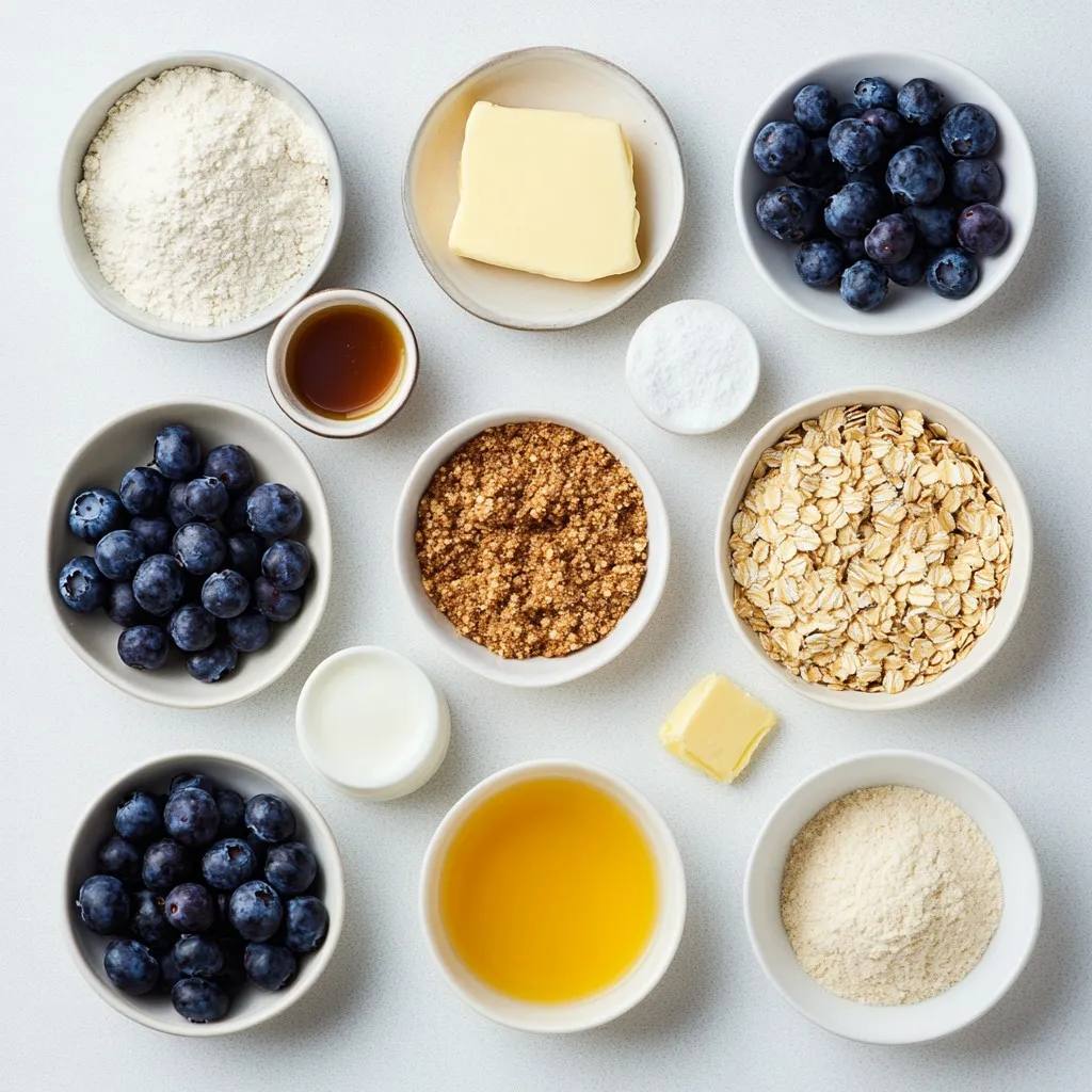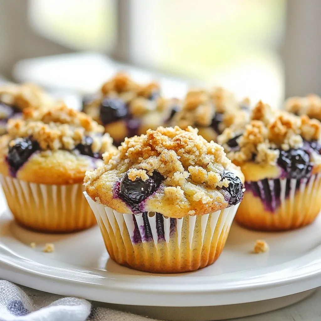 - 1 ½ cups all-purpose flour - ½ cup granulated sugar - ½ teaspoon baking powder - ½ teaspoon baking soda - ½ teaspoon salt - 1 large egg - ½ cup buttermilk (or yogurt) - ⅓ cup vegetable oil - 1 teaspoon vanilla extract - 1 cup fresh or frozen blueberries - For the crumble topping: - ½ cup rolled oats - ¼ cup brown sugar - ¼ cup all-purpose flour - ¼ teaspoon cinnamon - 3 tablespoons cold butter, diced The base of the muffins is all-purpose flour, which gives them a nice, light texture. I use granulated sugar to sweeten the batter just right. Baking powder and baking soda help them rise, making them fluffy. Salt enhances the flavor, balancing the sweetness. The egg adds richness and binds everything together. Buttermilk, or yogurt, keeps the muffins moist and adds a slight tang. Vegetable oil makes the muffins tender, while vanilla extract gives a lovely aroma. The star of the show is, of course, the blueberries. They add bursts of sweetness and color. For the crumble topping, rolled oats provide a hearty texture. Brown sugar adds a deep flavor, while flour helps bind it all. A pinch of cinnamon adds warmth, and cold butter creates that delightful crumbly texture. If you need a gluten-free option, use a 1:1 gluten-free flour blend in place of all-purpose flour. For a dairy-free option, replace buttermilk with almond milk mixed with a little vinegar. You can swap the egg with a flaxseed meal mixed with water for a vegan alternative. For lower sugar, you can cut back on granulated sugar and use a sugar substitute. The crumble can be made with coconut oil instead of butter for a dairy-free version. These swaps keep the muffins tasty while meeting different dietary needs. {{ingredient_image_2}} Start by preheating your oven to 350°F (175°C). This step is key for even cooking. Line a muffin tin with paper liners or grease it lightly. This helps the muffins release easily when baked. In a large bowl, mix together 1 ½ cups of all-purpose flour, ½ cup of granulated sugar, ½ teaspoon of baking powder, ½ teaspoon of baking soda, and ½ teaspoon of salt. Stir well until all the dry ingredients are combined. This blend creates a great base for your muffins. In a separate bowl, crack 1 large egg and beat it lightly. Add ½ cup of buttermilk (or yogurt), ⅓ cup of vegetable oil, and 1 teaspoon of vanilla extract. Whisk everything together until smooth. This mixture adds moisture to the muffins. Make a well in the center of the dry ingredients. Pour the wet mixture into this well. Gently stir with a spoon or spatula until just combined. It’s okay if there are a few lumps; overmixing can make them tough. Carefully fold in 1 cup of fresh or frozen blueberries. Use a spatula and be gentle to avoid smashing the berries. This step adds bursts of flavor and color to each muffin. In a small bowl, combine ½ cup of rolled oats, ¼ cup of brown sugar, ¼ cup of all-purpose flour, and ¼ teaspoon of cinnamon. Add 3 tablespoons of cold, diced butter. Mix with your fingers or a fork until it resembles coarse crumbs. This topping gives a sweet crunch. Divide the muffin batter evenly among the muffin cups, filling each about ¾ full. Sprinkle the crumble topping generously over each muffin. This creates a delightful texture. Place the muffin tin in your preheated oven. Bake for 18-20 minutes. Check for doneness by inserting a toothpick into the center. It should come out clean when they’re ready. Let the muffins cool in the pan for about 5 minutes. Then, transfer them to a wire rack to cool completely. Serve warm or at room temperature. Drizzle with honey or maple syrup for extra sweetness, and top with a fresh blueberry for a lovely touch. Enjoy your delicious blueberry crumble muffins! To make perfect blueberry muffins, follow these steps: - Use fresh ingredients. Fresh eggs and milk give the best results. - Don’t overmix the batter. Mix just until combined for light muffins. - Fill muffin cups to about ¾ full. This helps them rise nicely. - Bake at 350°F (175°C) for 18-20 minutes. This temperature gives a golden top. Many home cooks make these common mistakes: - Overmixing the batter makes muffins tough. Mix until just combined. - Not preheating the oven can lead to uneven baking. Always preheat first. - Skipping the crumble topping removes texture and flavor. Don’t skip it! Handling blueberries carefully is key. Here are some tips: - Rinse fresh blueberries gently under cool water. Pat them dry with a towel. - If using frozen blueberries, do not thaw them. Add them directly to the batter. - Fold blueberries in gently. This keeps them whole and prevents purple batter. Following these tips will help you create delicious blueberry crumble muffins every time! Pro Tips Fresh vs. Frozen Blueberries: If using frozen blueberries, do not thaw them before adding to the batter; this prevents them from bleeding into the muffins and keeps the color vibrant. Perfectly Light Muffins: Be careful not to overmix the batter when combining wet and dry ingredients. A few lumps are perfectly fine and will result in a fluffier muffin. Chill Your Butter: Ensure the butter for the crumble topping is cold before mixing to achieve that desired crumbly texture, giving the muffins a delightful crunch on top. Storage Advice: Store the muffins in an airtight container at room temperature for up to 3 days or freeze them for longer storage. Just reheat them in the microwave for a few seconds before serving! {{image_4}} You can swap blueberries for other fruits. Raspberries or strawberries work great. Chopped peaches add a nice touch too. Mix and match to find your favorite flavors. Every fruit brings its own taste and charm. Want to make these muffins healthier? Try whole wheat flour instead of all-purpose flour. You can use honey or maple syrup instead of granulated sugar. Greek yogurt can replace buttermilk. These swaps keep the muffins tasty while adding nutrition. Adding lemon zest gives a bright flavor. Just a