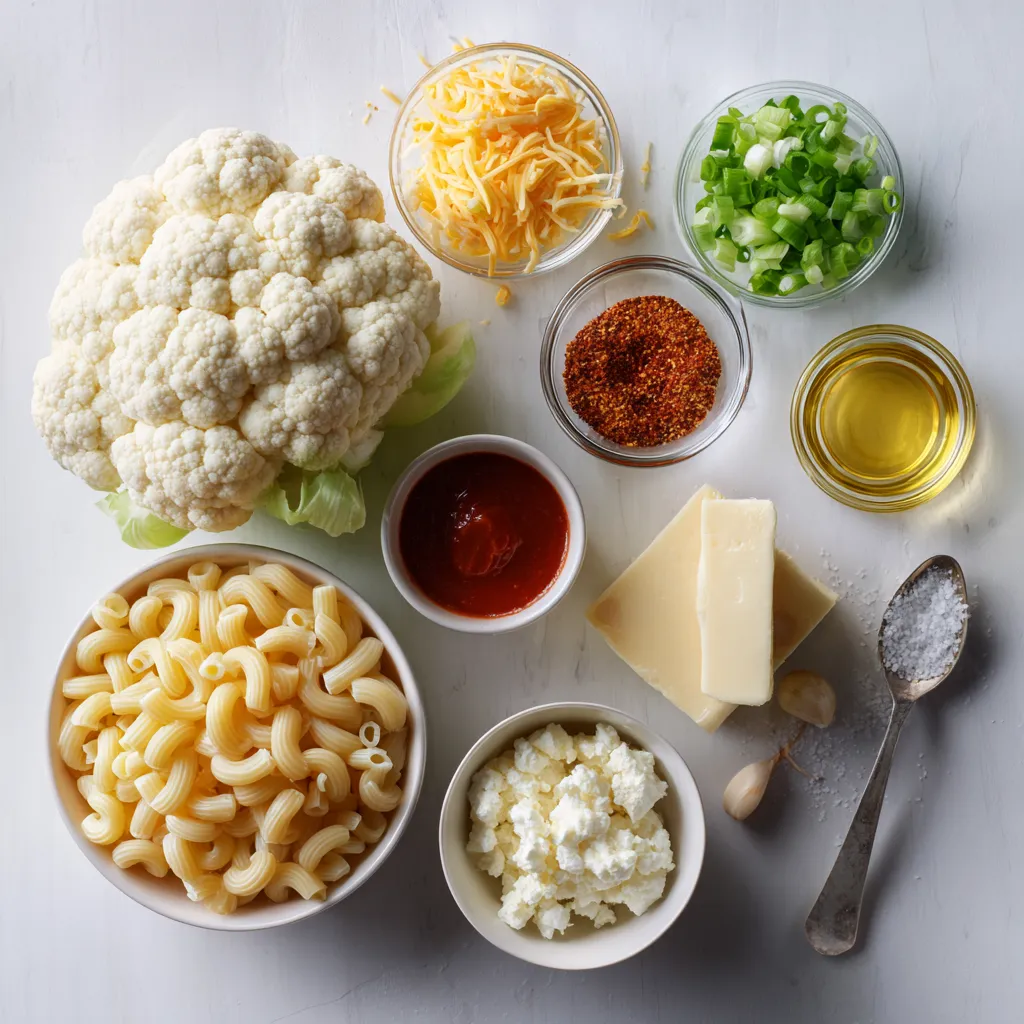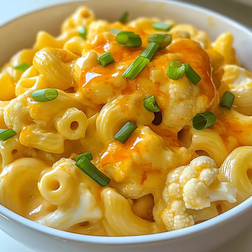 A spicy and creamy mac and cheese dish featuring roasted cauliflower and a rich cheese sauce.