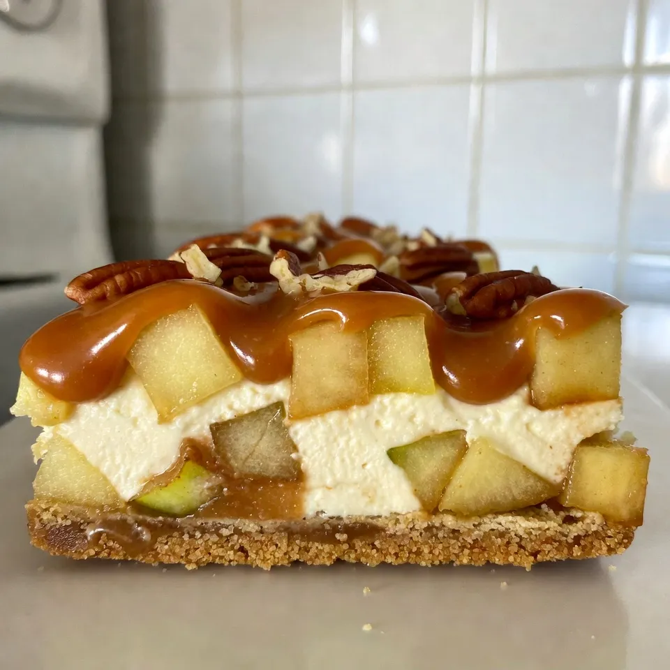 Delicious cheesecake bars with a caramel topping and apple pieces, perfect for dessert.