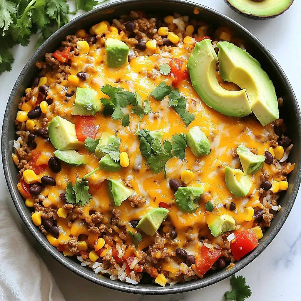 Once the cheese is beautifully melted, remove the skillet from heat. Garnish with freshly chopped cilantro. Serve the cheesy taco rice hot, accompanied by dollops of sour cream and slices of creamy avocado on the side.