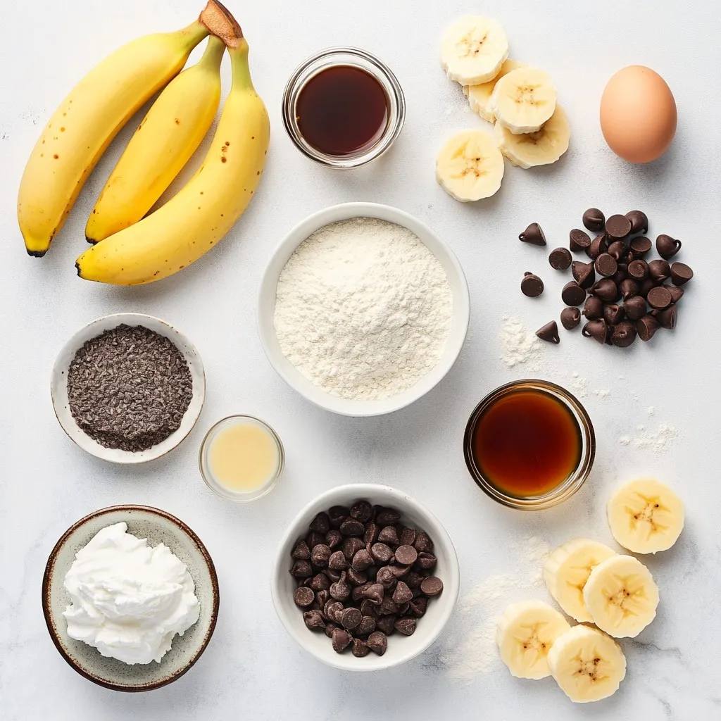These ingredients blend together to create delicious pancakes. Each item plays a role in flavor and texture. The mashed banana adds sweetness and moisture. The chocolate chips give a rich, sweet touch.