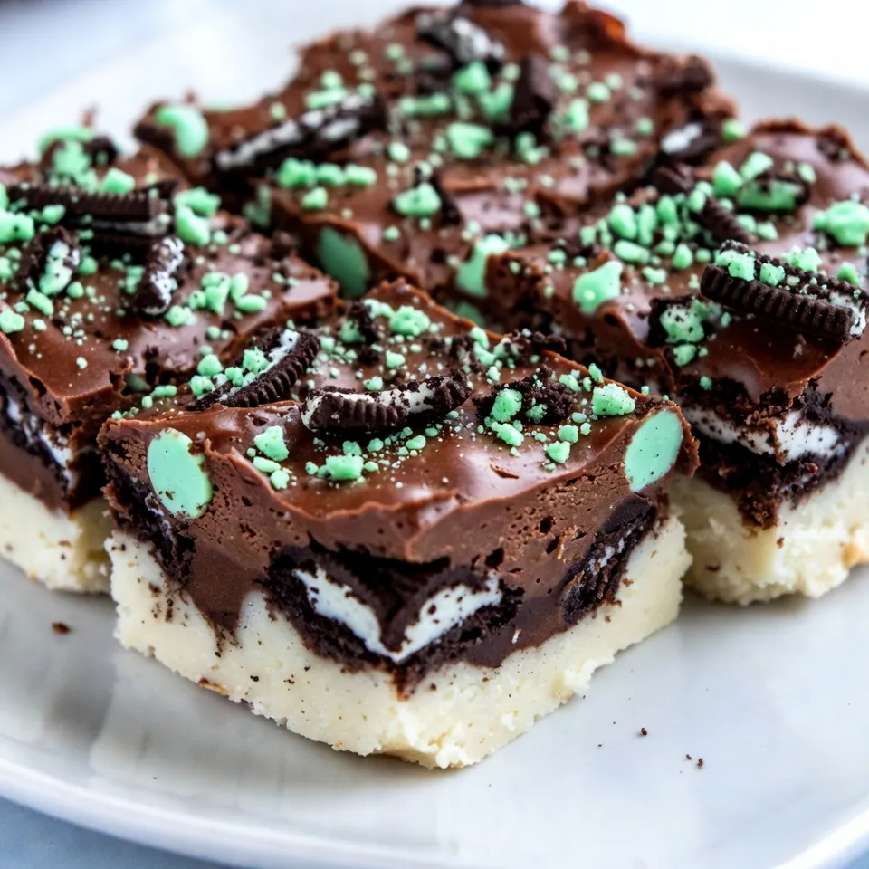 A rich and creamy fudge made with crushed Oreo cookies and mint chocolate, perfect for a sweet treat.