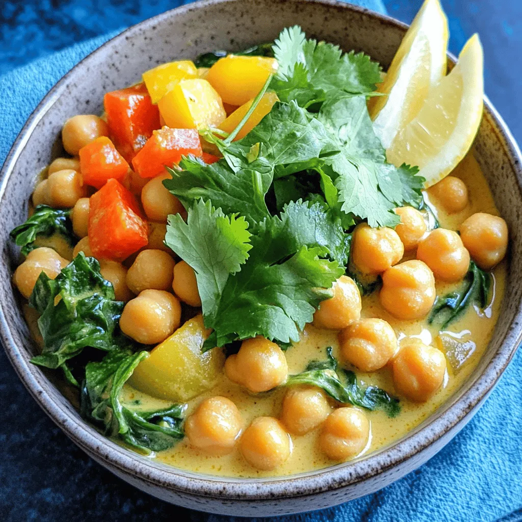 To make Coconut Curry Chickpeas, you need simple and fresh ingredients. Each one adds its own flavor to the dish. Here’s the list of ingredients you'll need: - 2 cans (15 oz each) chickpeas, thoroughly rinsed and drained - 1 can (13.5 oz) creamy coconut milk - 1 medium onion, finely diced - 3 cloves garlic, minced to a paste - 1-inch piece of fresh ginger, finely grated - 1 tablespoon aromatic curry powder - 1 teaspoon vibrant ground turmeric - 1 teaspoon earthy cumin - 1 teaspoon fragrant coriander - 1 tablespoon vegetable oil (such as canola or sunflower) - 1 bell pepper (choose red or yellow for sweetness), diced - 1 cup fresh spinach, roughly chopped - Salt and black pepper to taste - A handful of fresh cilantro, roughly chopped for garnish - Lemon wedges, to brighten the dish upon serving These ingredients work together to create a rich and creamy curry. The chickpeas provide protein and texture. The coconut milk makes it creamy and smooth. Aromatics like onion, garlic, and ginger bring depth to the flavor. The spices add warmth and a hint of earthiness. Fresh vegetables, like bell pepper and spinach, add color and nutrition. When you gather your ingredients, think about freshness. Fresh spices and produce will elevate your dish. For the full recipe, check out the recipe section above. Enjoy your cooking adventure! Heating the Oil Start by heating the vegetable oil in a large saucepan over medium heat. You want the oil to shimmer but not smoke. Sautéing the Aromatics Next, add the finely diced onion to the hot oil. Sauté it for about 3-4 minutes. Stir often until the onion is soft and clear. Adding Spices and Vegetables Then, mix in the minced garlic and grated ginger. Cook for one more minute. This will release their wonderful scents. After that, sprinkle in the curry powder, ground turmeric, cumin, and coriander. Stir well, cooking them for one minute to boost their flavors. Add the diced bell pepper next. Cook for another 3-4 minutes until it gets tender. Mixing in Coconut Milk and Chickpeas Now, pour in the creamy coconut milk. Add the rinsed chickpeas too. Stir everything together so that the chickpeas are well-coated in the sauce. Simmering the Curry Raise the heat slightly to bring the mix to a gentle simmer. Once it starts bubbling, lower the heat and cover the pan. Let it cook for 15-20 minutes. This time allows all the flavors to blend perfectly. Adding Spinach After simmering, stir in the chopped fresh spinach. Cook for another 2-3 minutes until it wilts down nicely. Final Seasoning and Garnishing Taste your curry now. Add salt and black pepper to make it perfect. Serve the warm Coconut Curry Chickpeas in bowls. Garnish with fresh cilantro and a squeeze of lemon juice. This adds a zesty finish. Enjoy this delightful dish straight from the Full Recipe! Adjusting Spice Levels You can change the spice level to match your taste. If you like it hot, add more curry powder or a pinch of cayenne. For a milder dish, cut back on the spices. Taste as you cook. This way, you find the right balance. Best Coconut Milk Choices Not all coconut milk is the same. Look for brands that say "full fat" for a creamy texture. Avoid those with added sugar. A good coconut milk makes the dish rich and smooth. Proper Sautéing for Flavor Development Start with the right heat. Heat the oil until it shimmers, but don’t let it smoke. Sauté the onion until it turns soft and clear. This step builds a strong flavor base. Add garlic and ginger next. These aromatics bring out the best taste. Simmering for Optimal Taste After mixing in the coconut milk and chickpeas, bring everything to a gentle simmer. This process melds the flavors together. Cover the pot and let it cook slowly. A good simmer allows the spices to blend well and develop rich flavors. Serving Over Rice or Quinoa For a complete meal, serve your Coconut Curry Chickpeas over fluffy rice or quinoa. This adds texture and makes the dish filling. The grains soak up the sauce, making every bite delicious. Enhancing Visual Appeal with Garnishes Garnish your dish for a beautiful look. Sprinkle fresh cilantro on top for color and flavor. Add lemon wedges to bring a bright touch. This extra step makes your meal more inviting and fun to eat. {{image_4}} You can change some ingredients in Coconut Curry Chickpeas to fit your taste. - Alternative Legumes: Use lentils or beans instead of chickpeas. Lentils cook quicker and add a different texture. Black beans or kidney beans bring a hearty feel. - Different Vegetables: Add carrots or zucchini for a twist. Carrots add sweetness, while zucchini gives a nice crunch. Feel free to mix and match! The spices in this dish can change the flavor a lot. Try these ideas to spice it up. - Hotter Curry Options: If you like it spicy, add cayenne pepper or chili flakes. Start with a little, then taste and adjust as needed. - Adding Fresh Herbs: Toss in fresh basil or mint for a bright note. These herbs add a fresh and lively touch. Just chop them and stir in right before serving. Coconut Curry Chickpeas can easily fit different diets. Here are some ideas. - Vegan Modifications: This recipe is already vegan! You can keep it plant-based by using veggie broth instead of water, if desired. - Gluten-Free Considerations: All the ingredients are gluten-free. Just check labels to ensure no hidden gluten in spices or stocks. This way, everyone can enjoy the dish without worry. For the full recipe, check out the link! To keep your Coconut Curry Chickpeas fresh, store them in an airtight container. Place the container in the fridge. The curry stays good for about four days. If you want to save it for later, freezing is a great option. Let the curry cool down first. Then, pour it into a freezer-safe bag or container. Make sure to remove as much air as possible. This helps prevent freezer burn. The curry can stay in the freezer for up to three months. When you're ready to enjoy leftovers, the best way to reheat is on the stove. P