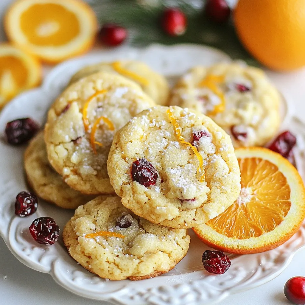 To make these delicious cranberry orange sugar cookies, gather the following ingredients: - 2 ½ cups all-purpose flour - 1 teaspoon baking soda - ½ teaspoon baking powder - ½ teaspoon salt - 1 cup unsalted butter, softened - 1 cup granulated sugar - ½ cup packed light brown sugar - 1 large egg - 1 teaspoon pure vanilla extract - Zest of 1 medium orange - 1 tablespoon freshly squeezed orange juice - 1 cup dried cranberries, roughly chopped - Extra granulated sugar for rolling If you need to convert measurements, here are some common conversions: - 1 cup = 240 ml - 1 teaspoon = 5 ml - ½ cup = 120 ml - ½ teaspoon = 2.5 ml These conversions help if you need different measuring tools or methods. You can swap some ingredients if you have dietary needs or preferences: - Butter: Use coconut oil or vegan butter for a dairy-free option. - Sugars: Replace granulated sugar with coconut sugar for a lower glycemic index. - Egg: Use a flax egg (1 tablespoon flaxseed meal + 2.5 tablespoons water) for a vegan choice. - Cranberries: Try dried cherries or raisins if you don’t have cranberries. Feel free to get creative with these substitutions while keeping the cookie’s overall flavor intact! {{ingredient_image_2}} Start by preheating your oven to 350°F (175°C). This step is key for even baking. While the oven heats, line two baking sheets with parchment paper. This prevents sticking and makes cleanup easy. Next, grab a medium bowl. Combine 2 ½ cups of all-purpose flour, 1 teaspoon of baking soda, ½ teaspoon of baking powder, and ½ teaspoon of salt. Use a whisk to blend these dry ingredients well. Set this bowl aside for later. In a large bowl, use an electric mixer to cream together 1 cup of softened unsalted butter, 1 cup of granulated sugar, and ½ cup of packed light brown sugar. Beat this mix on medium speed until it looks light and fluffy. This should take about 3 to 4 minutes. Now, add in 1 large egg, 1 teaspoon of pure vanilla extract, the zest of 1 medium orange, and 1 tablespoon of freshly squeezed orange juice. Mix these on low speed until everything is fully combined. You want a smooth mixture with no lumps. Gradually add the dry ingredients to the wet mixture. Mix gently until just combined. Be careful not to overmix. This helps keep your cookies nice and soft. Take a cookie scoop or a tablespoon to portion out the dough. Roll each piece into a ball and then coat in extra granulated sugar. Place them on the baking sheets, spacing them about 2 inches apart. To help them bake evenly, gently press each ball with the back of a fork or your palm. Once baked for 10-12 minutes, remove the cookies from the oven. They should have lightly golden edges and soft centers. Let them rest on the baking sheets for 5 minutes. Then, transfer the cookies to cooling racks to cool completely. This step is crucial for that perfect chewy texture! To get soft and chewy cookies, follow a few easy steps. First, use room temperature butter. This helps create a light and fluffy mix. When you blend the butter with the sugars, beat until it looks pale and creamy. Avoid overmixing your dough after adding flour. Just mix until you see no dry spots. This keeps your cookies tender. Many bakers make simple mistakes. One common error is not measuring flour correctly. Too much flour makes cookies dry. Always spoon flour into your measuring cup and level it off. Another mistake is baking cookies too long. Keep an eye on them. They should look soft and slightly underbaked in the middle when you take them out. Using the right tools helps you succeed. Here are must-have items for baking these cookies: - Mixing bowls: At least two sizes to separate wet and dry ingredients. - Electric mixer: For creaming butter and sugars easily. - Measuring cups and spoons: Accurate measurements are key to great cookies. - Cookie scoop: Makes it easy to portion dough evenly. - Parchment paper: Prevents sticking and helps with easy cleanup. - Cooling racks: Ensures cookies cool evenly without getting soggy. By following these tips, you'll create delicious cranberry orange sugar cookies every time! Pro Tips Chill the Dough: For even better flavor and texture, chill the cookie dough for at least 30 minutes before baking. This allows the flavors to meld and can also help the cookies maintain their shape while baking. Use Fresh Cranberries: If you have access to fresh cranberries, consider using them instead of dried. They will add a tartness that pairs beautifully with the orange and sugar. Experiment with Spices: Add a pinch of cinnamon or nutmeg to the dry ingredients for a warm, spiced flavor that complements the orange and cranberry beautifully. Store Properly: To keep your cookies fresh for longer, store them in an airtight container at room temperature. You can also freeze the cookies for up to three months for a sweet treat anytime! {{image_4}} You can make your cranberry orange sugar cookies even better by adding nuts or chocolate. Chopped walnuts or pecans add a nice crunch. They pair well with the soft texture of the cookie. If you prefer chocolate, try adding chocolate chips. Dark chocolate brings a rich flavor that balances the sweetness. Mix in about ½ cup of nuts or chocolate to the dough. This small change makes a big difference. Change up the dried fruit for a new taste. Instead of cranberries, try dried cherries or apricots. Chopped dates also work well. These fruits can add different flavors and textures. For a tropical twist, use dried mango or pineapple. Just remember to keep the amount around 1 cup. This keeps the cookie moist and flavorful. Spices can add depth to your cookies. Consider adding a pinch of cinnamon or nutmeg for warmth. They bring a cozy feel, especially in the fall and winter. A touch of ginger can add a zing that complements the orange. If you want something unique, try cardamom. Just ¼ teaspoon of any spice can enhance your cookies' flavor. Be creative and adjust the spices to your taste! To keep you