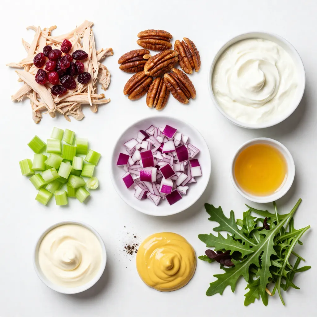 To make a delicious Cranberry Pecan Chicken Salad, you will need the following ingredients: - 2 cups cooked chicken breast, shredded or chopped - 1/2 cup dried cranberries - 1/2 cup pecans, roughly chopped - 1/4 cup celery, finely chopped - 1/4 cup red onion, finely chopped - 1/2 cup Greek yogurt - 2 tablespoons mayonnaise (optional, for creaminess) - 1 tablespoon honey (for a touch of sweetness) - 1 tablespoon Dijon mustard (for a hint of tang) - Salt and pepper to taste - Fresh arugula or mixed greens for serving This list packs flavor and texture into your salad. The chicken gives it substance, while cranberries add sweetness. Chopped pecans bring a nice crunch, and celery with red onion brings freshness. Greek yogurt provides creaminess while staying healthy, and you can add mayonnaise if you like it richer. Honey and Dijon mustard add depth to the dressing. Don't forget to season with salt and pepper! Finally, serve it over a bed of greens for a lovely presentation. {{ingredient_image_2}} To start, grab a large mixing bowl. In it, combine the cooked chicken breast, dried cranberries, chopped pecans, finely chopped celery, and red onion. Stir gently until all the ingredients mix well. This step creates a colorful base for your salad. Each ingredient adds texture and flavor. The sweet cranberries pair nicely with the crunchy pecans. Next, let’s make the dressing. In a separate small bowl, you will need: - 1/2 cup Greek yogurt - 2 tablespoons mayonnaise (optional) - 1 tablespoon honey - 1 tablespoon Dijon mustard - Salt and pepper to taste Whisk these ingredients together until smooth. If you like a creamier dressing, add the mayonnaise. Taste it and adjust the seasoning. Add more salt or pepper if needed. This dressing gives the salad a creamy, tangy kick. Now, pour the dressing over the chicken mixture. Use a spatula to fold the dressing in gently. Make sure every piece of chicken and veggie gets coated. This mixing is key for flavor. After that, cover the bowl with plastic wrap. Refrigerate the salad for at least 30 minutes. Chilling lets the flavors blend together. When you’re ready to serve, take fresh arugula or mixed greens. Arrange them on individual plates. Spoon the cranberry pecan chicken salad over the greens. Enjoy your fresh, flavorful dish! To boost the flavor, consider adding spices like garlic powder or paprika. These spices provide depth and warmth. You can also mix in some chopped apples for a fresh crunch. For a sweet twist, try adding a dash of cinnamon. For a beautiful plate, serve the salad on a bed of arugula or mixed greens. This adds color and freshness. You can garnish with extra chopped pecans and a scattering of dried cranberries. Fresh herbs like parsley or chives also add a nice touch. Efficient prep makes cooking easier. Shred the chicken while it’s still warm for easier handling. Use pre-chopped vegetables if you can. This saves time. Chilling the salad for at least 30 minutes is key. This step helps all the flavors blend together. It also makes the salad taste better. Enjoying a well-chilled salad feels refreshing and satisfying. Pro Tips Use Rotisserie Chicken: To save time, consider using store-bought rotisserie chicken. It adds great flavor and makes preparation a breeze. Customize Your Nuts: Feel free to swap pecans for walnuts or almonds if you prefer a different nut flavor or if you have allergies. Adjust the Sweetness: If you like a sweeter salad, increase the honey or add a few more dried cranberries. Taste as you go! Serve with Toasted Bread: For a delightful crunch, serve the salad on toasted whole-grain bread or alongside crackers for a satisfying meal. {{image_4}} If you want to change up the protein in your salad, substituting chicken is easy. You can use shredded turkey or cooked shrimp. These options keep the salad light and flavorful. For a plant-based twist, try chickpeas or tofu. Both add protein and texture. You can also use tempeh for a nutty taste. Switching nuts or dried fruits can create new flavors. Instead of pecans, try walnuts or almonds. These nuts give a nice crunch. For dried fruits, consider raisins or apricots. Each fruit brings its own sweetness. Mixing and matching can help you find your favorite combo. You can easily make the dressing vegan or lower in calories. Instead of Greek yogurt, use silken tofu blended until smooth. This keeps the creamy texture. Using less mayo or skipping it also cuts calories. Adding fresh herbs like dill or basil boosts flavor. You can even sprinkle in some spices like paprika for a kick. To keep your cranberry pecan chicken salad fresh, use an airtight container. Glass or plastic containers work great. Make sure the lid seals tightly to keep air out. This helps keep the flavors and texture intact. Always store the salad in the fridge. It tastes best when chilled. You can freeze this chicken salad, but it may change texture. If you choose to freeze it, use a freezer-safe container. Make sure to leave some space at the top, as the salad may expand. To eat it later, thaw it in the fridge overnight. Reheat gently in the microwave, but the salad is best served cold. In the fridge, your cranberry pecan chicken salad lasts about 3 to 4 days. Always check for signs of spoilage. If it smells bad or has a slimy texture, it’s time to toss it. Freshness is key to enjoying this tasty dish. Keep an eye on your leftovers to ensure they stay safe to eat. To make your salad healthier, you can swap some ingredients. Here are some ideas: - Use plain Greek yogurt instead of mayonnaise. - Add more veggies like bell peppers or spinach. - Choose low-sugar dried cranberries. - Use a smaller amount of honey for sweetness. - Consider grilled chicken for less fat. These changes keep the flavor while lowering calories. Yes, you can prepare this salad ahead of time. Here are some tips: - Make the salad up to a day before serving. - Store it in an airtight container in the fridge. - Keep the dressing separate 