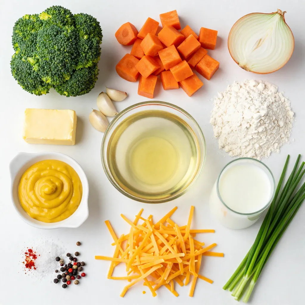 - 2 cups fresh broccoli florets - 1 cup carrots, diced - 1 medium onion, finely chopped - 3 cloves garlic, minced - 4 tablespoons unsalted butter - 1/4 cup all-purpose flour - 4 cups vegetable broth - 1 cup whole milk - 2 cups shredded sharp cheddar cheese - 1 teaspoon Dijon mustard - Salt and pepper, to taste - A pinch of red pepper flakes (optional for heat) - Fresh chives, chopped, for garnish To make this creamy broccoli cheddar soup, you need fresh and simple ingredients. Start with two cups of fresh broccoli florets. They add color and nutrition. Next, use one cup of diced carrots. The carrots add sweetness and texture. You will also need one medium onion, finely chopped. The onion brings a strong flavor base. Add three cloves of minced garlic for an aromatic touch. For the pantry staples, gather four tablespoons of unsalted butter. This will help create a rich flavor. You also need a quarter cup of all-purpose flour. This helps thicken the soup. Next, grab four cups of vegetable broth. This gives the soup depth. Use one cup of whole milk for creaminess. Now for the flavor enhancers. You will need two cups of shredded sharp cheddar cheese. This is what makes the soup cheesy and delicious. A teaspoon of Dijon mustard adds a nice tang. Don't forget salt and pepper to taste. If you like a little heat, add a pinch of red pepper flakes. Lastly, chop fresh chives for garnish. They add a pop of color and flavor. With these ingredients, you can create a warm and comforting soup. {{ingredient_image_2}} - Step 1: Melt 4 tablespoons of unsalted butter in a large pot over medium heat. Once melted, add 1 medium onion, finely chopped, and 1 cup of diced carrots. Sauté for about 5 minutes until the onion is soft and clear. - Step 2: Next, add 3 cloves of minced garlic to the pot. Cook for an additional minute. Stir it gently so it doesn’t burn. - Step 3: Now, sprinkle 1/4 cup of all-purpose flour over the veggies. Stir constantly for about 2-3 minutes. This mixture will thicken and form a roux. - Step 4: Gradually whisk in 4 cups of vegetable broth. Keep stirring to avoid lumps. Bring the mixture to a gentle simmer, stirring often. - Step 5: Add in 2 cups of fresh broccoli florets. Cook for 10-12 minutes until the broccoli is tender but still bright green. - Step 6: Lower the heat and stir in 1 cup of whole milk, 1 teaspoon of Dijon mustard, and 2 cups of shredded sharp cheddar cheese. Mix until the cheese melts and the soup is creamy. - Step 7: Season the soup with salt, pepper, and a pinch of red pepper flakes for some heat. Taste and adjust the seasoning if needed. - Step 8: For a smoother texture, use an immersion blender to puree part of the soup. You can also blend it in batches for the right consistency. - Step 9: Once ready, ladle the soup into bowls and top with freshly chopped chives for a pop of color and flavor. You can switch up the cheese for fun flavors. Try gouda for a smoky twist. Fontina gives a creamy touch, while pepper jack adds spice. If you want a richer soup, use half-and-half instead of milk. This keeps it creamy without being too heavy. You can also swap the vegetable broth for chicken broth if you like. Using an immersion blender is easy and quick. You can blend the soup right in the pot. This method makes it smooth without extra dishes. If you use a regular blender, let the soup cool a bit before blending. Blend in batches and be careful with hot liquids. Aim for a creamy yet slightly chunky texture for the best taste. Add herbs like thyme or rosemary for more depth. A splash of lemon juice brightens the flavors. You can also stir in a bit of nutmeg for warmth. For serving, crusty bread pairs well with the soup. Consider a light salad on the side for balance. Add croutons on top for extra crunch and fun! Pro Tips Freshness Matters: Always use fresh broccoli for the best flavor and texture in your soup. Cheese Choice: Opt for sharp cheddar cheese for a bolder flavor that stands out in the creamy base. Perfect Consistency: For a creamier soup, blend a portion of the soup with an immersion blender to achieve your desired texture. Seasoning is Key: Don’t forget to taste the soup before serving and adjust the seasoning to enhance the flavors. {{image_4}} You can make your creamy broccoli cheddar soup even better by adding seasonal veggies. Carrots and peas work well in spring. Try squash in the fall. Each vegetable brings new flavors and colors. You can also swap cheese types to change the taste. For a milder soup, use Monterey Jack. For a bolder flavor, try smoked gouda. Each choice makes the soup unique. If you want a gluten-free version, use gluten-free flour for the roux. This helps thicken the soup without wheat. You can also make a vegan version. Use plant-based milk instead of whole milk. Choose a dairy-free cheese to keep it creamy. These changes keep the soup tasty while meeting different diets. Some people like chunky soup, while others prefer it smooth. If you want a chunky soup, don’t blend it. Just cook the broccoli until it’s tender. For a creamier texture, use an immersion blender. Blend part of the soup until smooth, then stir it back in. You can also add grains or protein for more substance. Quinoa or cooked chicken can make the soup heartier. To keep your creamy broccoli cheddar soup fresh, store it in an airtight container. Make sure it cools down first before sealing it. This helps to avoid extra moisture inside the container. When you reheat it, heat it slowly over low heat. Stir often to keep it from sticking to the pot. You can freeze this soup for later meals. First, let it cool fully. Then, pour it into freezer-safe containers, leaving some space at the top for expansion. When you’re ready to eat it, move the soup to the fridge to thaw overnight. For quick thawing, put the container in warm water. In the fridge, this soup lasts about 3 to 4 days. If frozen, it can last up to 3 months. Look for signs of spoilage like off smells, changes in