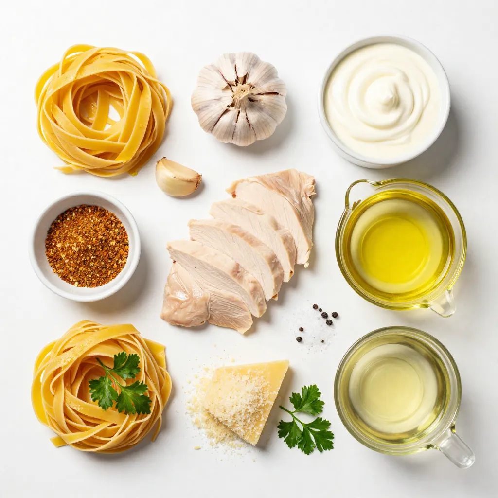 - 8 oz fettuccine pasta - 2 tablespoons olive oil - 1 pound boneless, skinless chicken breasts, cut into thin strips - 2 tablespoons Cajun seasoning - 3 cloves garlic, finely minced - 1 cup heavy cream - 1 cup freshly grated Parmesan cheese - 1/2 cup chicken broth - Salt and pepper, to taste - Fresh parsley, finely chopped (for garnish) When you make creamy Cajun chicken Alfredo, quality matters. Use fresh ingredients for the best taste. Choose good fettuccine pasta. Look for one made from durum wheat for a nice bite. The Cajun seasoning should be robust. I prefer a mix with paprika, cayenne, and herbs. Freshly grated Parmesan cheese makes a big difference. It melts better and tastes richer than pre-shredded cheese. You can easily adjust this recipe for dietary needs. For gluten-free options, use gluten-free fettuccine. If you want a dairy-free version, try coconut cream and a dairy-free cheese. You can also swap the chicken for shrimp or tofu for a different protein. Always check labels for allergens. {{ingredient_image_2}} Start by boiling a large pot of salted water. Add 8 oz of fettuccine pasta. Cook it for 8 to 10 minutes or until it's just right—al dente. Drain the pasta and set it aside. Keep about half a cup of the pasta water for later. Next, heat 2 tablespoons of olive oil in a big skillet over medium-high heat. Season 1 pound of thinly sliced chicken breasts with 2 tablespoons of Cajun seasoning, plus salt and pepper. Cook the chicken for 6 to 8 minutes until it's golden brown and cooked through. Once done, take the chicken out and place it on a plate. In the same skillet, lower the heat to medium. Add 3 cloves of minced garlic and cook it for about 1 minute until it smells great. Pour in 1 cup of heavy cream and 1/2 cup of chicken broth. Stir well and let it simmer gently for 2 to 3 minutes. This helps all the flavors mix. Now, it’s time to make it creamy! Gradually whisk in 1 cup of freshly grated Parmesan cheese. Keep whisking until the cheese melts and the sauce is smooth. Taste it and add more salt or pepper if needed. Then, return the cooked fettuccine and your sautéed chicken to the skillet. Toss everything together well. If the sauce is too thick, add a bit of the reserved pasta water. Plate the creamy Cajun chicken Alfredo in wide bowls. For a nice touch, sprinkle fresh parsley on top. You can even add more Parmesan or a dash of Cajun seasoning for extra flair. Enjoy your meal! To cook fettuccine just right, use a large pot. Fill it with water and add salt. Bring the water to a rolling boil. Add the pasta and stir. Cook it for about 8-10 minutes until it is al dente. This means it should be firm, not mushy. When the pasta is done, drain it well but save some water. This water can help adjust the sauce later. For a creamy Alfredo sauce, you need the right balance of cream and cheese. Start with heavy cream and chicken broth. Heat them in your skillet after cooking the chicken. Whisk in Parmesan cheese slowly. It should melt smoothly. If the sauce is too thick, add a bit of the reserved pasta water. This will help make it creamy and easy to coat the pasta. You can boost flavor in your dish easily. Try adding vegetables like bell peppers or spinach to the skillet when you cook the chicken. They will add color and nutrition. You can also adjust the spice level. If you love heat, add more Cajun seasoning. A pinch of red pepper flakes can give it a nice kick. Don’t be afraid to experiment! Pro Tips Adjust the Spice Level: If you prefer a milder dish, reduce the amount of Cajun seasoning or use a mild version of it to suit your taste. Perfectly Cooked Chicken: Ensure your chicken strips are uniform in size for even cooking, and avoid overcrowding the skillet to achieve a nice sear. Cheese Choice: For an extra depth of flavor, consider mixing in some smoked Gouda or fontina cheese along with the Parmesan. Leftover Storage: Store any leftovers in an airtight container in the refrigerator for up to 3 days. Reheat gently on the stove with a splash of cream or broth to revive the sauce. {{image_4}} If you want more heat, add extra spices. Increase the Cajun seasoning for a bolder flavor. You can also add some crushed red pepper flakes. This will bring a nice, spicy kick. Just remember, start with a little. You can always add more if you want. Want to add more color and nutrition? Toss in some bell peppers or spinach. Slice bell peppers into strips and sauté them with the chicken. Spinach can be added to the sauce at the end. It wilts quickly and adds a nice green touch. This variation makes the dish healthier and more filling. If you prefer something different than chicken, try shrimp or tofu. Shrimp cooks fast and adds a seafood twist. Just sauté them like you do the chicken. For a vegetarian option, use firm tofu. Cut it into cubes, sauté until golden, and mix it in. Each alternative gives a new flavor and texture. To keep your creamy Cajun chicken Alfredo fresh, let it cool first. Then, place it in an airtight container. Store it in the fridge for up to three days. Make sure to avoid letting it sit out for too long. This helps prevent bacteria growth. When you're ready to enjoy your leftovers, reheat them gently. You can use the stove or microwave. If using the stove, add a splash of chicken broth or cream. This helps bring back the creamy texture. Heat it on low until warmed through. Stir often to prevent sticking. If using the microwave, cover the dish loosely. Heat in short bursts, stirring in between. You can freeze creamy Cajun chicken Alfredo for later. Use a freezer-safe container and leave some space at the top for expansion. Label the container with the date. It can stay in the freezer for up to three months. To thaw, place it in the fridge overnight. Reheat it as mentioned above. It may not be as creamy, but it still tastes great! Cajun seasoning is a mix of spices. Common ingredients include paprika, cayenne pepper, garlic powder, onion powder, and black p