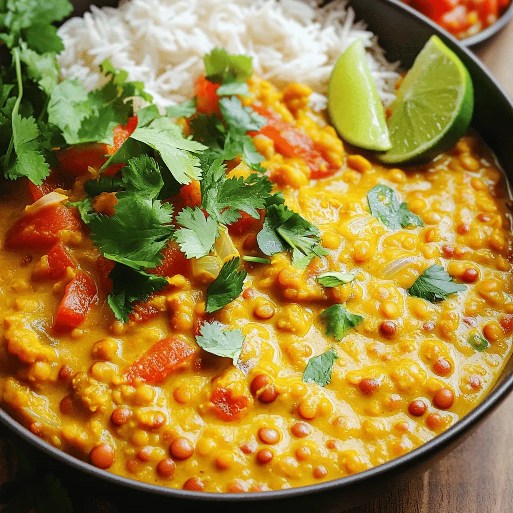 - 1 cup red lentils, thoroughly rinsed - 1 can (400ml) full-fat coconut milk - 1 medium onion, finely chopped - 3 cloves garlic, minced - 1 tablespoon fresh ginger, grated - 1 tablespoon curry powder - 1 teaspoon ground turmeric - 1 teaspoon ground cumin - 1 cup vegetable broth (or homemade vegetable stock) - 1 tablespoon extra virgin olive oil - 1 cup diced tomatoes (fresh or canned) - Sea salt and freshly ground black pepper, to taste - Fresh cilantro, finely chopped (for garnish) - Lime wedges (for serving) In this recipe, each ingredient plays a key role. Red lentils serve as the main protein. They are quick to cook and turn soft. Coconut milk adds creaminess and a hint of sweetness. Onion, garlic, and ginger give it a great base flavor. The spices—curry powder, turmeric, and cumin—bring warmth and depth. They create a rich aroma that fills your kitchen. Vegetable broth adds moisture and enhances the taste. Tomatoes add acidity and balance. Lastly, garnishes like cilantro and lime give a fresh touch. These little details make your meal pop. You can adjust the salt and pepper based on your taste. Each ingredient works together to create a dish that is both simple and flavorful. 1. Heating oil and sautéing onions In a large saucepan, add one tablespoon of extra virgin olive oil. Heat it over medium heat until it shimmers. Then, add one medium onion, finely chopped. Sauté the onion for about 5 minutes. You want them soft and translucent. 2. Adding garlic, ginger, and spices Next, stir in three minced garlic cloves and one tablespoon of freshly grated ginger. Cook this mix for 1-2 minutes. The aroma will fill your kitchen. Now, sprinkle in one tablespoon of curry powder, one teaspoon of ground turmeric, and one teaspoon of ground cumin. Stir to toast these spices for about one minute. 3. Stirring in tomatoes, lentils, and broth Pour in one cup of diced tomatoes, fresh or canned. Let them cook for 3-4 minutes. Stir now and then until they soften. After that, add one cup of red lentils that you’ve rinsed well. Then, pour in one cup of vegetable broth. Stir everything together and bring it to a gentle simmer. 4. Simmering and finishing with coconut milk Once it simmers, lower the heat. Cover the pan with a lid and let it cook for about 15 minutes. This will make the lentils tender. After 15 minutes, gently stir in one can of full-fat coconut milk. Let this simmer for another 5 minutes. The flavors will meld beautifully. Season with sea salt and freshly ground black pepper to taste. This simple method creates a creamy coconut lentil curry that’s both tasty and satisfying. Enjoy the process, and soon you'll have a wonderful meal ready to savor! - Rinse red lentils well before use. This step removes dust and improves texture. - Taste your curry as it cooks. Adjust seasoning with salt and pepper for better flavor. - Cook lentils until they are tender but not mushy. This usually takes about 15 minutes. - Serve the curry in deep bowls for a cozy look. It helps show off the creamy texture. - Garnish with fresh cilantro for a pop of color and flavor. Lime wedges add a zesty touch. - Pair the curry with fluffy basmati rice or warm naan. This combination makes a complete meal. {{image_4}} You can change the flavor and texture by using different lentils. While red lentils work best, green or brown lentils add a nice bite. They will take longer to cook, so you might need to adjust the time. Adding veggies boosts nutrition and flavor. Spinach adds a bright color and soft texture. Carrots bring a sweet crunch. You can mix in any of your favorite vegetables. Just chop them small so they cook evenly. Feel free to play with spices. If you like heat, add red pepper flakes or chopped chili. For a different taste, try adding garam masala or coriander. These spices change the flavor profile and make the dish unique. You can also add proteins to make this meal more filling. Chickpeas work well and add a nice creaminess. Tofu is another great option. Just cube it and add with the lentils. This way, you create a hearty dish that everyone will enjoy. To keep your creamy coconut lentil curry fresh, store it in an airtight container. Let it cool completely before sealing. This way, it will stay tasty and safe to eat. The recommended shelf life is about 3 to 5 days in the fridge. Always check for any signs of spoilage before enjoying it again. When it's time to enjoy your leftovers, reheat the curry gently. The best methods are on the stove or in the microwave. If using the stove, warm it over low heat. Stir often to keep it from sticking. If you use the microwave, heat it in short bursts, stirring in between. Make sure it is heated to at least 165°F (75°C) for safety. Avoid reheating more than once to keep it safe and tasty. Enjoy your meal again! How to adjust the recipe for dietary restrictions? You can easily adapt this dish. For a vegan option, this recipe is already plant-based. If you need gluten-free, ensure your broth is gluten-free. You can replace coconut milk with almond milk for a lighter version, but it won’t be as creamy. If you're avoiding legumes, try using diced sweet potatoes instead of lentils. Can I freeze the curry and how long does it last? Yes, you can freeze this curry! Store it in an airtight container. It keeps well for about three months in the freezer. To reheat, let it thaw overnight in the fridge. Then, warm it on the stove over low heat, stirring gently. If it’s too thick, add a little broth or water. What are the best sides to serve with the curry? I love serving this curry with fluffy basmati rice. It soaks up the sauce nicely. You can also serve it with warm naan bread for dipping. A side of simple salad adds a fresh crunch. For extra flavor, try a mango chutney as a sweet contrast. This blog post covered how to make a tasty creamy coconut lentil curry. We discussed the key ingredients like red lentils, coconut milk, and spices. The step-by-step instructions made cook