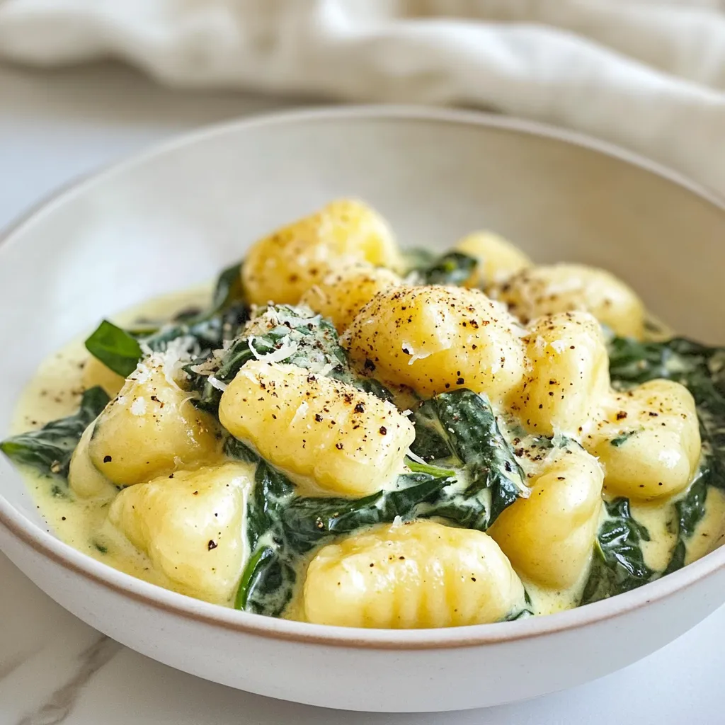 A rich and creamy gnocchi dish with fresh spinach and Parmesan cheese.
