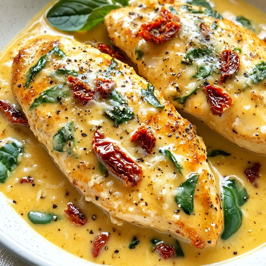 A rich and creamy chicken dish featuring sun-dried tomatoes and fresh spinach, perfect for a comforting meal.