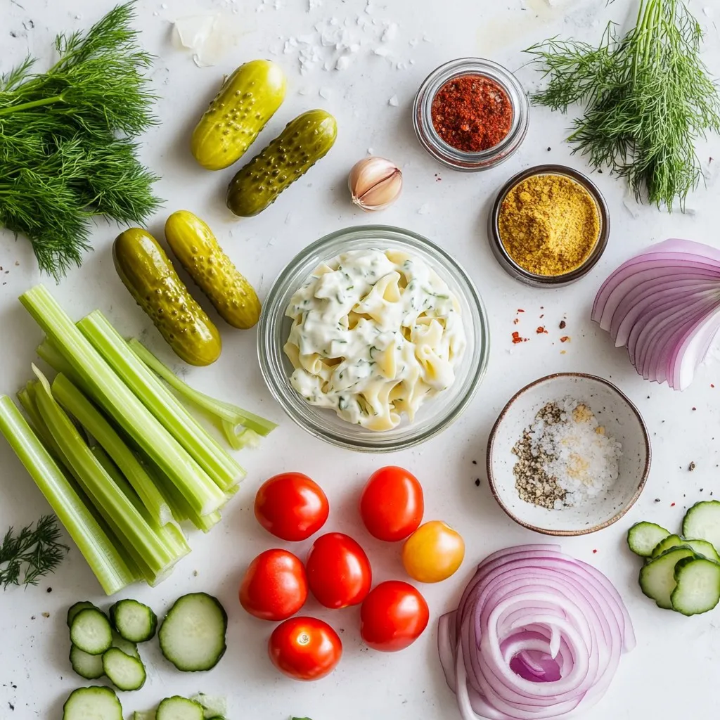 Mix the Vegetables: In a large mixing bowl, combine the diced dill pickles, finely chopped red onion, chopped celery, and halved cherry tomatoes. Stir gently to mix the vegetables evenly.