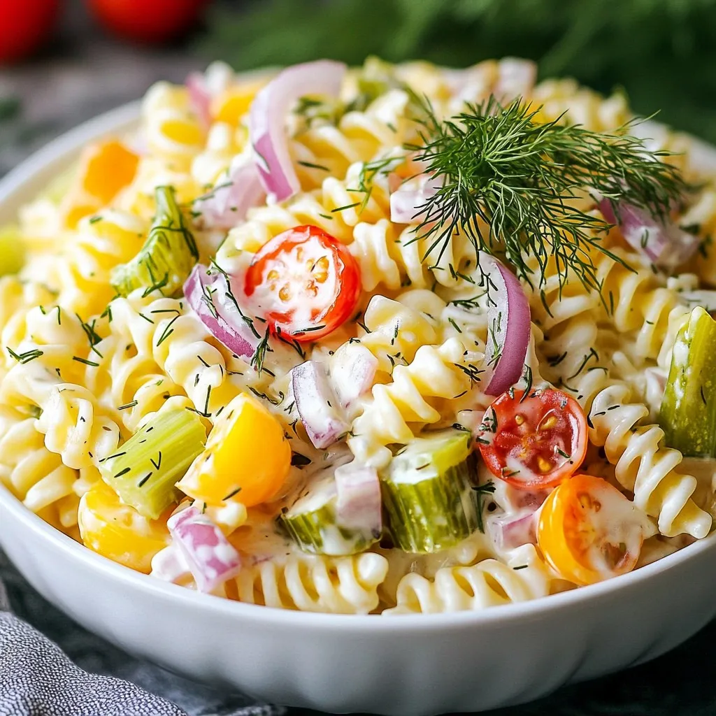 A refreshing pasta salad with dill pickles and a creamy dressing, perfect for summer gatherings.
