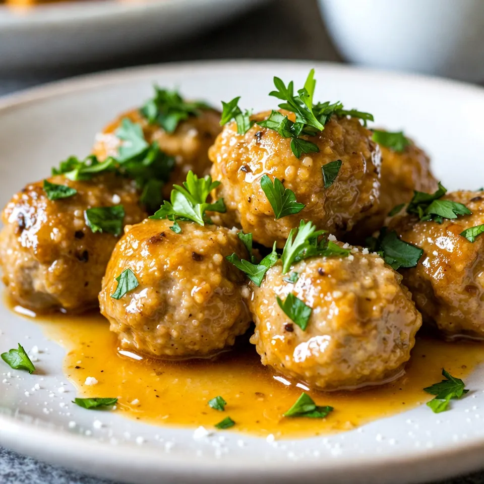 - 1 lb (450g) ground chicken - 1/2 cup (50g) breadcrumbs (preferably Italian style) - 1/4 cup (25g) finely grated Parmesan cheese - 1/4 cup (15g) fresh parsley, finely chopped - 4 cloves garlic, minced (adjust to taste) - 1 teaspoon onion powder - 1/2 teaspoon salt (to taste) - 1/2 teaspoon freshly ground black pepper - 4 tablespoons unsalted butter - 2 tablespoons olive oil (extra virgin recommended) - Zest of 1 lemon (for brightness) Gather these ingredients before you start. The ground chicken serves as a great base. I like Italian-style breadcrumbs for added flavor and texture. Parmesan cheese adds a rich taste. Fresh parsley brightens the dish and makes it pretty. The garlic is key for that classic flavor. Onion powder, salt, and pepper round out the seasoning. They bring everything together nicely. For cooking, I use unsalted butter and olive oil. They add great taste and help with browning. The lemon zest gives a fresh kick to the garlic butter sauce. Make sure you have everything ready. This will make your cooking smooth and easy. {{ingredient_image_2}} - In a large bowl, combine: - 1 lb ground chicken - 1/2 cup breadcrumbs - 1/4 cup grated Parmesan cheese - 1/4 cup chopped fresh parsley - 1 large egg - 4 minced garlic cloves - 1 teaspoon onion powder - 1/2 teaspoon salt - 1/2 teaspoon black pepper - Mix the ingredients well using your hands or a spoon. Be careful not to overmix; this keeps your meatballs tender. - Preheat your oven to 400°F (200°C). Line a baking sheet with parchment paper. - Shape the meatball mixture into balls about 1 to 1.5 inches wide. Place them on the baking sheet. - Heat 2 tablespoons of olive oil in a large skillet over medium heat. - Cook the meatballs in batches, turning them until they are brown and crisp. This takes about 3-4 minutes per batch. - Once all meatballs are browned, transfer the baking sheet to the oven. - Bake for 10-15 minutes, or until the internal temperature reaches 165°F (75°C). Use a meat thermometer to check. - In the same skillet, lower the heat to medium-low after removing the meatballs. - Add 4 tablespoons of unsalted butter and let it melt. - Stir in the minced garlic and lemon zest. Cook for about 2 minutes until fragrant. Keep stirring to prevent burning. - Once the meatballs are baked, add them to the skillet with the garlic butter sauce. - Gently toss the meatballs in the sauce for 1-2 minutes. This helps them soak up the delicious flavors. - Serve the meatballs warm, garnished with fresh parsley for a nice burst of color. - Avoid overcrowding the skillet. This helps the meatballs brown well. If too many meatballs go in at once, they will steam, not brown. Cook in batches to keep that nice crisp. - Use a meat thermometer for accuracy. This ensures your meatballs reach 165°F (75°C). It's the best way to know they are safe to eat. - Adjust garlic to taste. If you love garlic, add more! Start with four cloves, but feel free to increase it. - Add herbs like thyme or rosemary for extra flavor. These herbs pair well with the garlic butter sauce and elevate the dish. Fresh herbs make everything better. - Plate the meatballs on a large serving dish or individual plates. Drizzle the garlic butter sauce over them for a glossy look. - For an artistic touch, add a wedge of lemon on the side. This adds color and a zesty flavor to the dish. Fresh parsley also brightens the plate and adds freshness. Pro Tips Use Fresh Garlic: Freshly minced garlic enhances the flavor of the meatballs and the sauce significantly compared to pre-minced garlic. Don’t Overmix: When combining the meatball ingredients, mix just until combined to keep the meatballs tender and prevent them from becoming tough. Check for Doneness: Use a meat thermometer to ensure the meatballs reach an internal temperature of 165°F (75°C) for safe consumption. Customize the Flavor: Feel free to add your favorite herbs or spices to the meatball mixture for a personalized flavor twist. {{image_4}} You can make garlic butter chicken meatballs healthier. Here are two easy swaps: - Use ground turkey or leaner chicken. - Choose whole grain or gluten-free breadcrumbs. These changes cut fat and boost fiber. Ground turkey has less fat than chicken. Whole grain breadcrumbs add nutrients. You can change the flavor with spices and extras. Here are some ideas: - Add spices like smoked paprika or cayenne for heat. - Mix in feta cheese or sun-dried tomatoes for a twist. These options give your meatballs a fresh taste. Smoked paprika adds warmth, while feta offers creaminess. Think about how you want to serve your meatballs. Here are some fun ideas: - Pair them with pasta, rice, or a fresh salad. - Create meatball subs or sliders for a fun meal. These pairings make your dinner complete. Meatballs in a sub bring joy to any meal. To store your garlic butter chicken meatballs, let them cool first. Place them in an airtight container. This keeps them fresh and tasty. I like to use glass containers or plastic ones with tight lids. They help seal in flavor and moisture. If you want to freeze the meatballs, arrange them on a baking sheet. Make sure they are not touching. Freeze them for about one hour. Once frozen, transfer them to a freezer bag. Remove as much air as you can. This helps prevent freezer burn. To thaw, place them in the fridge overnight. If you need them fast, use the microwave. Reheat them in the oven at 350°F (175°C) until warm. Make sure they reach an internal temp of 165°F (75°C) for safety. In the fridge, these meatballs last up to four days. If you freeze them, they stay good for about three months. After that, they may lose flavor and texture. Always label your containers with dates to keep track. You can check if chicken meatballs are done by using a meat thermometer. The internal temperature should reach 165°F (75°C). This ensures they are safe to eat. If you don’t have a thermometer, cut one open. It should be white inside, not pink. Yes, you can prepare the