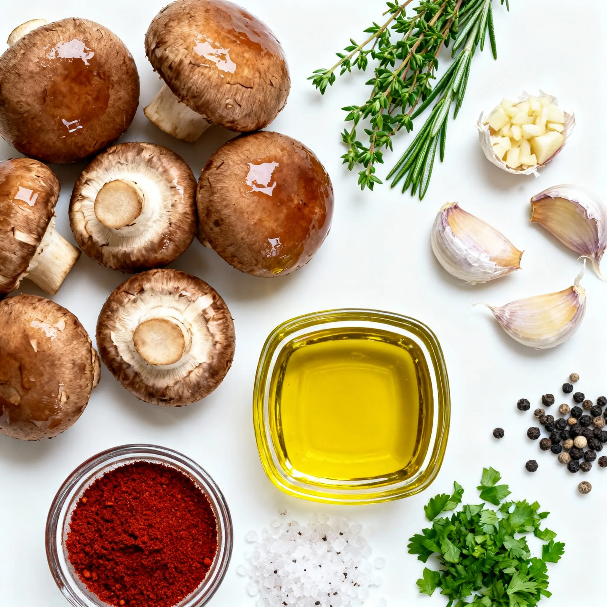 In a large mixing bowl, combine the cleaned button mushrooms with the olive oil, minced garlic, fresh thyme, fresh rosemary, smoked paprika, and a generous sprinkle of salt and pepper.