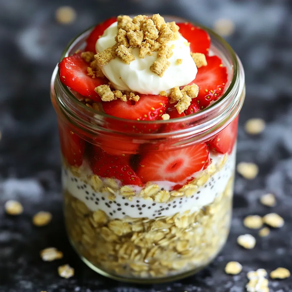 - 1 cup rolled oats - 1 cup almond milk (or any milk of your preference) - 1/2 cup plain Greek yogurt - 1 tablespoon chia seeds - 1 tablespoon vanilla protein powder - 1 tablespoon honey or maple syrup - 1 teaspoon vanilla extract - 1 cup fresh strawberries, hulled and sliced - 2 tablespoons cream cheese, softened to room temperature - Optional: crushed graham crackers for topping Each ingredient plays a key role. The rolled oats provide a hearty base. Almond milk keeps it creamy and light. Greek yogurt adds protein and tang. Chia seeds bring fiber and help the oats thicken. The vanilla protein powder boosts the protein content. Honey or maple syrup sweetens the dish, while the vanilla extract enhances the flavor. Fresh strawberries give a burst of fruity freshness. Cream cheese adds that rich cheesecake taste. Crushed graham crackers? They are optional but add a fun crunch. You can adjust the sweetness with honey or maple syrup based on your taste. This dish is customizable and fun! 1. Start by mixing the wet ingredients. In a medium bowl, combine 1 cup of rolled oats, 1 cup of almond milk, 1/2 cup of plain Greek yogurt, 1 tablespoon of chia seeds, 1 tablespoon of vanilla protein powder, 1 tablespoon of honey or maple syrup, and 1 teaspoon of vanilla extract. Whisk everything until smooth. 2. Next, fold in the strawberries. Add 1 cup of hulled and sliced fresh strawberries, but save a few slices for later. Gently mix until the strawberries are evenly spread. 3. Now, prepare the cream cheese mixture. In a small bowl, blend 2 tablespoons of softened cream cheese with an extra teaspoon of honey. Mix until it is creamy and smooth. 4. It’s time to layer! Start with the oat mixture in a jar or container. Add some of the cream cheese mixture between the layers. Keep layering until you finish both mixtures. This creates a nice cheesecake texture. 1. Once you layer everything, cover the container tightly. Place it in the refrigerator overnight. If you’re short on time, chill it for at least 4 hours. 2. The recommended chilling time is overnight. This helps the oats soften and flavors blend perfectly. The next day, you’ll have a delicious treat waiting for you! You can change the sweetness of your oats. If you want it sweeter, add more honey or maple syrup. You can also use a bit of stevia or agave if you like. Try adding spices like cinnamon or nutmeg. A sprinkle of these can make your oats taste even better. They add warmth and depth to your dish. Layering is key for a great texture. Start with a layer of oats, then add cream cheese, and repeat. This gives a nice mix of creamy and chewy. For some crunch, sprinkle crushed graham crackers between the layers or on top. The crunch will contrast with the smooth cream cheese. Top your oats with fresh strawberries or other berries for color and taste. You can also add a dollop of Greek yogurt on top. This adds extra creaminess. For a fun look, serve in clear jars. Guests can see the layers, making it more appealing. {{image_4}} You can change the fruit in your overnight oats. Instead of strawberries, try blueberries or raspberries. These berries add a great taste and color. You can also use banana and peanut butter. Slice the banana and mix it in. The peanut butter gives a creamy texture and boosts the flavor. If you want dairy-free options, there are many choices. You can swap Greek yogurt for coconut yogurt or soy yogurt. For cream cheese, try cashew cream for a rich flavor. As for milk, almond milk works well, but you can use oat milk or soy milk instead. These swaps keep your oats creamy and delicious. Adding more protein is easy. You can mix in nut butter or seeds. They not only add protein but also healthy fats. For a vegan protein boost, try using pea protein or hemp protein powder. These options are great for keeping your oats filling and nutritious. For storage, use airtight containers. Glass jars work well. They keep the oats fresh and let you see the layers. Always let the mixture cool before sealing. This helps avoid condensation. To maintain freshness, store your oats in the refrigerator. Keep them covered to protect from odors. It also prevents the oats from drying out. In the refrigerator, these oats last for up to three days. After that, they may lose flavor and texture. For longer storage, freezing is an option. You can freeze individual portions in airtight bags or containers. When you are ready to eat, thaw in the fridge overnight. You can also microwave them for a quick meal. Just add a splash of milk to restore creaminess. Yes, you can make this recipe vegan with a few simple swaps. Use plant-based yogurt instead of Greek yogurt. For the cream cheese, choose a vegan cream cheese. Almond milk works well, but you can use any plant milk you prefer. Swap honey with maple syrup or agave nectar for sweetness. These changes keep the creamy texture and flavor while making it vegan-friendly. You can store overnight oats in the fridge for up to five days. Use an airtight container to keep them fresh. The oats will soften and the flavors will blend over time, making them even tastier. Just remember to add any fresh toppings, like strawberries or graham crackers, right before serving. Yes, you can reheat them. To do this, transfer the oats to a microwave-safe bowl. Heat them for about 30 seconds at a time, stirring in between. You can also add a splash of almond milk to make them creamier. If you prefer, you can enjoy them cold straight from the fridge. Both ways are delicious! This blog post walks you through an easy overnight oats recipe. We covered ingredients, step-by-step prep, and tips for flavor and texture. Variations let you switch things up with different fruits or proteins. Storing your oats properly keeps them fresh longer, too. Overnight oats are simple, tasty, and versatile. You can enjoy them any time. Try them out, and enjoy your breakfast!