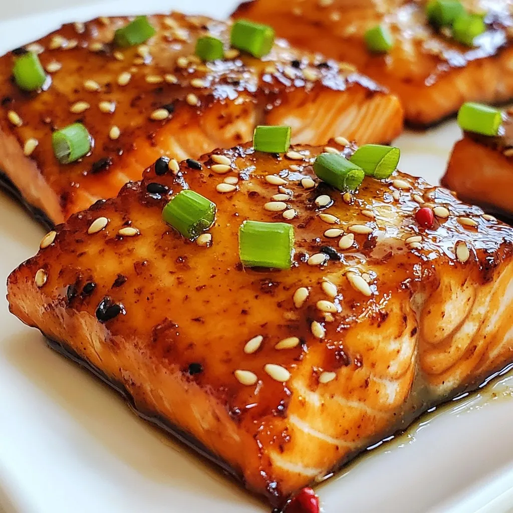 Here is a simple list of what you need to make honey garlic glazed salmon: - 4 salmon fillets (approximately 6 oz each) - 1/4 cup honey - 3 cloves of garlic, finely minced - 2 tablespoons low sodium soy sauce - 1 tablespoon fresh ginger, finely grated - 1 tablespoon olive oil - Salt and freshly cracked pepper, to taste - 1 tablespoon sesame seeds (for garnish) - 2 green onions, thinly sliced (for garnish) These ingredients create a sweet and savory dish. The honey adds a nice touch of sweetness. The garlic and ginger give a bold flavor. Together, they make the salmon shine. I love that this meal is quick and easy to prepare. You can find all these ingredients at your local grocery store. Plus, they are simple to work with. This dish is perfect for a quick weeknight meal or a special dinner. {{ingredient_image_2}} - In a small saucepan, combine honey, minced garlic, soy sauce, and grated ginger. - Stir well and simmer for 2-3 minutes. This helps the flavors mix and the sauce thicken. - Preheat a large skillet or grill pan over medium-high heat. - Add olive oil and let it heat for a moment. - While the pan heats, season the salmon fillets with salt and freshly cracked pepper. - Make sure to coat both sides evenly. - Carefully place the salmon fillets in the hot skillet, skin side down. - Cook for 4-5 minutes until the skin is crispy. The salmon should flake easily with a fork. - Gently flip the fillets over and pour half of the honey garlic sauce on top. - Cook for an additional 3-4 minutes. This allows the salmon to cook through and the sauce to caramelize. - Remove the skillet from heat and drizzle the rest of the sauce over the salmon. - This boosts the flavor and adds a nice glaze. - Transfer the honey garlic glazed salmon to a serving platter. - Garnish with sesame seeds and thinly sliced green onions for a lovely look and taste. - Importance of pan temperature: Heat your pan well before adding the salmon. A hot pan helps form a nice crust. This gives the fish great texture. Too low heat can make the fish soggy. - Avoiding overcooking: Salmon cooks fast. Watch it closely. Cook until it flakes easily with a fork. Remove it from heat just in time to keep it juicy. - Suggestions for additional herbs or spices: Want to add more flavor? Try adding fresh herbs like parsley or cilantro. You could also sprinkle in some chili flakes for a kick. - Pairing options with sides: Serve the salmon with steamed veggies like asparagus or broccoli. Jasmine rice or quinoa makes a great side too. These pairings balance the meal nicely. - Garnishing techniques: To make your dish pop, sprinkle sesame seeds on top. Add sliced green onions for a fresh look. This adds color and a nice crunch. - Serving suggestions: Serve the salmon on a bright platter. Arrange the sides neatly. A sprig of fresh herb on the side can make it even prettier. Serve it hot for the best taste! Pro Tips Use Fresh Ingredients: Ensure to use fresh salmon and high-quality honey for the best flavor in your dish. Adjust Sweetness: Feel free to adjust the amount of honey according to your taste; you can even substitute with maple syrup for a different flavor profile. Monitor Cooking Time: Cooking times may vary based on the thickness of the salmon fillets, so keep an eye on them to avoid overcooking. Experiment with Garnishes: Consider adding sliced jalapeños or cilantro for a spicy kick or fresh herb flavor to enhance your presentation. {{image_4}} You can change the ingredients to fit your taste. If you want a different sweetness, try maple syrup instead of honey. The flavor will still be great, and it’s a fun twist! You can also use other fish like tilapia or trout. They cook nicely and soak up the sauce well. Baking the salmon is an easy way to cook it. Preheat your oven to 400°F. Place the salmon on a lined baking sheet, and pour the sauce over it. Bake for about 12-15 minutes. This method keeps the fish moist and tender. Another option is broiling. This gives a crispy top. To broil, set your oven to high. Place the salmon on the top rack. Broil for 6-8 minutes. Keep a close eye to avoid burning. If you need gluten-free options, use tamari instead of soy sauce. It tastes just as good! For those on a low-carb diet, skip the sugar. You can still enjoy the dish by cutting back on the sauce or using a sugar-free substitute. These adjustments help everyone enjoy this tasty meal without worry. To store leftover honey garlic glazed salmon, place it in an airtight container. Make sure the salmon cools to room temperature before sealing. This way, it stays fresh longer. I recommend using glass or BPA-free plastic containers. These keep the fish safe and help prevent odors. Leftovers can last in the fridge for about 3 days. If you want to freeze the salmon, wrap each fillet tightly in plastic wrap. Then, place the wrapped salmon in a freezer-safe bag. Squeeze out as much air as you can to prevent freezer burn. You can freeze the salmon for up to 3 months. When you’re ready to eat, thaw the salmon in the fridge overnight. This slow thawing keeps the texture nice. If you need it faster, you can place the sealed bag in cold water for about an hour. To check if your salmon is done, use a food thermometer. The fish should reach an internal temperature of 145°F (63°C). When it flakes easily with a fork, it’s ready. Always check the thickest part of the fillet. If you don’t have a thermometer, look for a change in color. Cooked salmon turns from bright pink to a lighter shade. Yes, you can swap out honey for other sweeteners. Maple syrup works well and adds a nice flavor. Agave syrup is another good option. Just keep in mind that each sweetener has its own taste. You may want to adjust the amount based on how sweet you like it. Pair your salmon with delicious sides to make a great meal. Here are some tasty ideas: - Steamed asparagus - Jasmine rice - Quinoa - Roasted vegetables - Mixed green salad These sides balance the rich flavor of the s