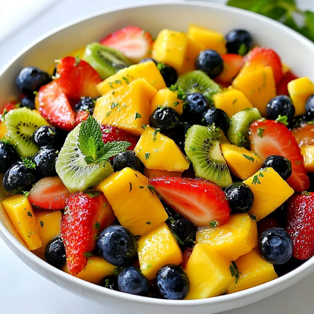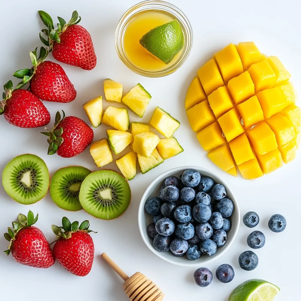 - 2 cups fresh strawberries, greens removed and halved - 2 cups ripe kiwis, peeled and sliced - 1 cup plump blueberries - 1 cup sweet pineapple, diced - 1 cup juicy mango, diced When making this fruit salad, I love using fresh, ripe fruits. Strawberries bring a sweet burst. Kiwis add a tangy kick. Blueberries offer a nice pop of color and sweetness. Pineapple adds a tropical flair, while mango gives a smooth texture. Each fruit plays a part in making the salad refreshing and delicious. - 3 tablespoons pure honey - 2 tablespoons freshly squeezed lime juice - Zest of 1 lime, finely grated The dressing is simple yet flavorful. Honey adds sweetness, while lime juice gives a nice zing. The zest enhances the lime flavor, making the dressing bright and refreshing. This combination brings all the fruits together beautifully. - Fresh mint leaves Mint leaves are a great choice for garnishing. They add color and a fresh aroma. You can sprinkle them on top right before serving. This small touch makes your salad look even more inviting and adds a hint of flavor. {{ingredient_image_2}} Start with a large mixing bowl. Add the hulled and halved strawberries. Next, toss in the peeled and sliced kiwis. Then, add the plump blueberries, diced pineapple, and juicy mango. Use a spatula or a large spoon. Gently toss the fruit together. This helps mix the colors and flavors. Be careful not to bruise any fruit. You want each piece to stay whole and pretty. Grab a small bowl for the dressing. Combine three tablespoons of pure honey with two tablespoons of freshly squeezed lime juice. Next, add the finely grated zest of one lime. Whisk these ingredients together. Keep whisking until the honey blends smoothly with the lime juice. A smooth dressing makes every bite burst with flavor. Drizzle the honey-lime dressing over the fruit mixture in the large bowl. With a gentle hand, toss the fruits again. Make sure every piece gets a nice coat of the dressing. Cover the bowl with plastic wrap or a lid. Then, place it in the refrigerator for about 30 minutes. This chilling step lets the flavors meld beautifully. When ready to serve, gently stir the salad again. Garnish with fresh mint leaves for a pop of green and freshness. When choosing fruits, look for bright colors and firm textures. Fresh strawberries should be red and plump. Avoid any with soft spots. For kiwis, pick ones that feel slightly soft when pressed. Blueberries should be smooth and dry, while pineapples should smell sweet at the base. Choose mangoes that yield a bit to the touch, indicating ripeness. To make your fruit salad pop, think about adding some extra elements. A sprinkle of chili powder on mango adds a spicy kick. You can also mix in shredded coconut for a tropical feel. For a zesty touch, try adding a splash of orange juice. These additions will enhance the sweet and tangy flavors of the salad. The dressing should be smooth and easy to pour. If it's too thick, whisk in a bit more lime juice. This will help it coat the fruit better. When mixing the dressing, make sure to blend the honey well with the lime juice and zest. A good mix ensures every bite is flavorful. Pro Tips Choose Ripe Fruits: Select fruits that are at their peak ripeness for the best flavor and sweetness in your salad. Mix with Care: Gently toss the fruits to prevent bruising, keeping your salad looking fresh and vibrant. Chill for Flavor: Allow the salad to chill for at least 30 minutes before serving—this enhances the flavors as they meld together. Fresh Mint Garnish: Use fresh mint leaves not only for garnish but also to add a refreshing aroma that complements the fruit flavors. {{image_4}} To give your Honey Lime Fruit Salad a tropical twist, swap in fruits like papaya, passion fruit, or starfruit. These fruits add unique flavors and a fun look. You can mix in ripe bananas for a creamy texture. Just remember, the key is to keep the balance of sweet and tangy. The honey-lime dressing goes well with these tropical fruits too! If you love berries, try a berry-only version of this salad. Use strawberries, blueberries, raspberries, and blackberries. This mix creates a colorful and vibrant dish. The honey and lime dressing enhances the natural sweetness of the berries. This version is perfect for summer picnics or brunches with friends. For a delightful crunch, add nuts or seeds to your salad. Chopped almonds, walnuts, or pecans work great. You can also use sunflower seeds or pumpkin seeds. Just sprinkle them on top right before serving. This adds texture and makes the salad more filling. The crunch pairs nicely with the soft fruit and sweet dressing. To keep your Honey Lime Fruit Salad fresh, use an airtight container. This helps prevent air from getting in. Make sure to store it in the fridge. If you have some mint leaves, add them just before serving. Mint can wilt quickly and lose its bright look in the container. When stored properly, your fruit salad will stay fresh for about 2 to 3 days. The flavors will mingle even more, making it taste great. However, keep an eye on the fruit. If you see any signs of spoilage, it’s best to toss it out. When you’re ready to serve it again, give the salad a gentle stir. This helps mix the honey-lime dressing that may settle at the bottom. If the fruit looks a bit soft, it’s still safe to eat. However, fresh fruit always has the best taste! You might want to add a few new mint leaves for a fresh look. Yes, you can make this salad ahead of time. I recommend preparing it no more than four hours in advance. This time frame keeps the fruits fresh and tasty. Just remember to chill it in the fridge. If you make it too early, the fruit may get mushy. If you need a honey swap, try maple syrup or agave nectar. Both options add sweetness similar to honey. You can also use a sugar substitute if you prefer. Just make sure it dissolves well in the lime juice. To keep fruit fresh, use lemon or lime juice. These juices slow down browning. Toss the frui