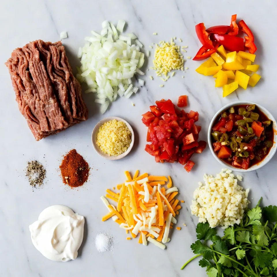 1. Gather all your ingredients. You will need ground beef, onion, garlic, bell pepper, diced tomatoes, green chilies, taco seasoning, cheeses, cauliflower rice, sour cream, salt, and pepper.