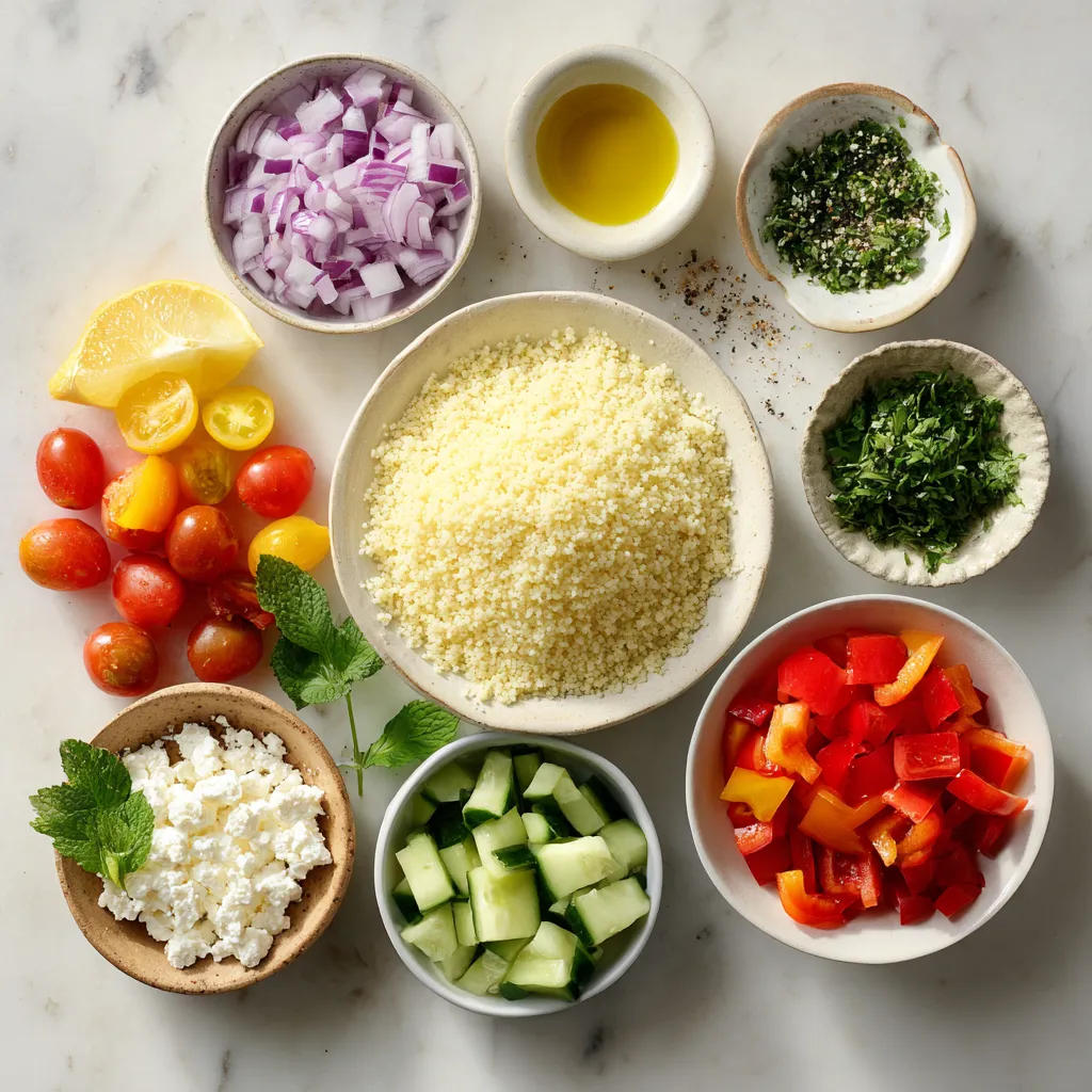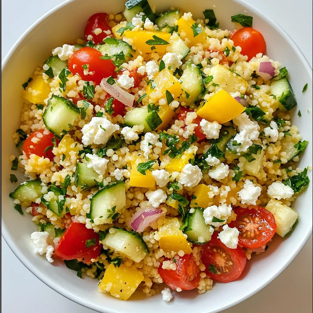 Each ingredient plays a key role in creating a bright and fresh flavor profile. The couscous serves as a light base, while the veggies add crunch and color. Fresh herbs provide a burst of brightness. The feta adds creaminess, making the salad rich and satisfying. The dressing combines olive oil and lemon juice, creating a zesty finish. You’ll love the balance of flavors in each bite!