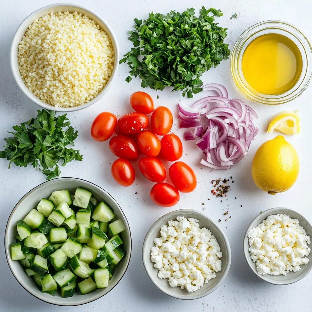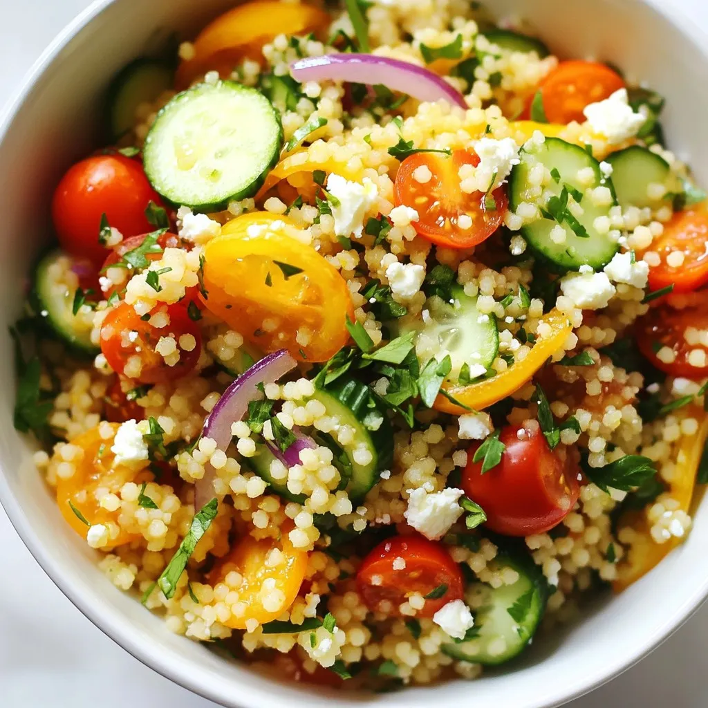 The main ingredients offer a fresh and colorful mix. Couscous provides a light base. The vegetable broth adds flavor right from the start. Fresh vegetables like cucumber, cherry tomatoes, and red onion add crunch and taste. The herbs, parsley, and mint, bring a bright pop. If you like, add feta cheese for some creaminess.