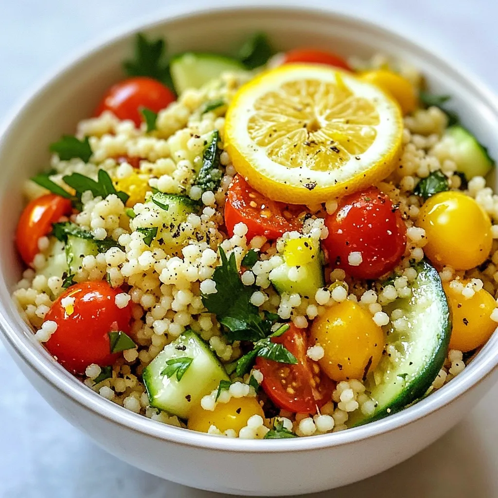 To make lemon pepper couscous, gather these simple ingredients: - 1 cup couscous - 1 and 1/4 cups vegetable broth - 2 tablespoons extra virgin olive oil - Zest of 1 large lemon - 2 tablespoons freshly squeezed lemon juice - 1 teaspoon freshly cracked black pepper - 1/2 teaspoon fine sea salt - 1/4 cup fresh parsley, finely chopped - 1/4 cup cherry tomatoes, halved - 1/4 cup cucumber, diced You can easily swap some ingredients if needed. - Couscous: Try quinoa or farro for a different texture. - Vegetable broth: Chicken broth works well for extra flavor. - Olive oil: Use avocado oil for a different taste. - Lemon: Lime juice and zest can add a fun twist. - Parsley: Fresh basil or cilantro works too. - Tomatoes and cucumber: Bell peppers or radishes can add crunch. Fresh ingredients make a big difference in flavor. Using fresh lemon juice and zest brightens the dish. Fresh herbs, like parsley, add a lovely aroma. When you use fresh produce, your couscous tastes vibrant and delicious. Always choose the best ingredients for the best results! {{ingredient_image_2}} Start by gathering all your ingredients. You will need couscous, vegetable broth, olive oil, lemon zest, lemon juice, black pepper, sea salt, parsley, cherry tomatoes, and cucumber. Measure everything out first. This makes cooking easier and faster. In a medium saucepan, pour the vegetable broth. Heat it over medium flame until it boils. The sound of boiling broth is a good sign. Once it boils, take the pot off the heat. Add the couscous to the broth. Then, stir in the olive oil, lemon zest, lemon juice, black pepper, and sea salt. Mix well to combine all the flavors. Cover the pot with a lid and let it sit for about five minutes. After five minutes, remove the lid. Use a fork to fluff the couscous. This step makes the grains light and fluffy. Be gentle so you don’t mash them. Next, add the fresh parsley, cherry tomatoes, and diced cucumber. Mix everything together gently. Taste it to see if you need more salt or pepper. Adjust as you like. You can serve the couscous warm or let it cool. For a nice touch, serve it in a bowl with extra lemon slices and parsley on top. When making lemon pepper couscous, avoid adding too much liquid. Use exactly 1 and 1/4 cups of vegetable broth. If you add more, the couscous may become mushy. Another mistake is not letting the couscous sit covered for 5 minutes. This step helps the grains absorb the flavors. Lastly, don’t skip the fluffing step. Fluffing with a fork makes the couscous light and airy. To boost the flavor, use fresh lemon juice and zest. This adds brightness and zing. You can also mix in herbs like basil or mint for a fresh taste. If you want a spicy kick, try adding red pepper flakes. For a nutty flavor, toast the couscous lightly in the pan before adding broth. This adds depth and richness to the dish. Make your couscous look appealing by garnishing it. Add thin lemon slices on top or a sprinkle of fresh parsley. You can also serve it in a colorful bowl to catch the eye. For a fun twist, layer the couscous with diced vegetables in a glass. This creates a beautiful, colorful dish that everyone will love. Pro Tips Fresh Ingredients: Use fresh parsley, tomatoes, and cucumbers for the best flavor and texture in your couscous. Flavor Boost: Consider adding a pinch of red pepper flakes or chopped olives for an extra layer of flavor in your dish. Chill for a Salad: For a refreshing cold salad, let the couscous cool completely and mix in additional veggies or feta cheese. Meal Prep Friendly: This couscous can be made ahead of time and stored in the fridge, making it perfect for meal prep or quick lunches. {{image_4}} You can make Lemon Pepper Couscous even more exciting with Mediterranean flavors. Try adding olives, feta cheese, and bell peppers. These ingredients bring saltiness and richness. You can also include artichoke hearts and capers for a unique twist. Fresh herbs like basil or mint add a refreshing touch. If you want to boost the protein in your dish, consider adding grilled chicken or shrimp. Both pair well with the light flavor of couscous. For a vegetarian option, chickpeas make a great choice. They add protein and fiber, making the meal heartier. You can mix in cooked lentils for an extra layer of flavor and nutrition. Want to change the flavor? Swap lemon for lime for a zesty kick. You can also try orange zest and juice for a sweeter twist. For a spicy kick, add red pepper flakes or a dash of hot sauce. Each of these options offers a new taste experience while keeping the dish fun and fresh. After enjoying your lemon pepper couscous, let it cool down. Place leftovers in an airtight container. This helps keep the couscous fresh and tasty. You can store it in the fridge for up to three days. If you want to keep it longer, consider freezing. To reheat couscous, add a splash of water or broth. Place it in a saucepan over medium heat. Stir often until it's warm throughout. You can also microwave it. Cover the bowl with a damp paper towel. Heat in short bursts, stirring in between, until warm. Couscous lasts three to five days in the fridge. If you freeze it, use it within three months. To freeze, pack it in airtight containers or freezer bags. Make sure to remove as much air as possible. Thaw the couscous in the fridge overnight before reheating. This keeps the texture nice and fluffy. Couscous is made from semolina flour. It comes from durum wheat. The flour is moistened and rolled into tiny granules. This process creates the light, fluffy texture we love. Couscous is a staple in North African cuisine. It cooks quickly and absorbs flavors well, making it perfect for dishes like Lemon Pepper Couscous. Yes, you can make Lemon Pepper Couscous ahead of time. Prepare it and let it cool. Store it in an airtight container in the fridge. It can last for up to three days. When ready to serve, just reheat it gently. You can add a splash of broth or lemon juice to liven it up. This makes
