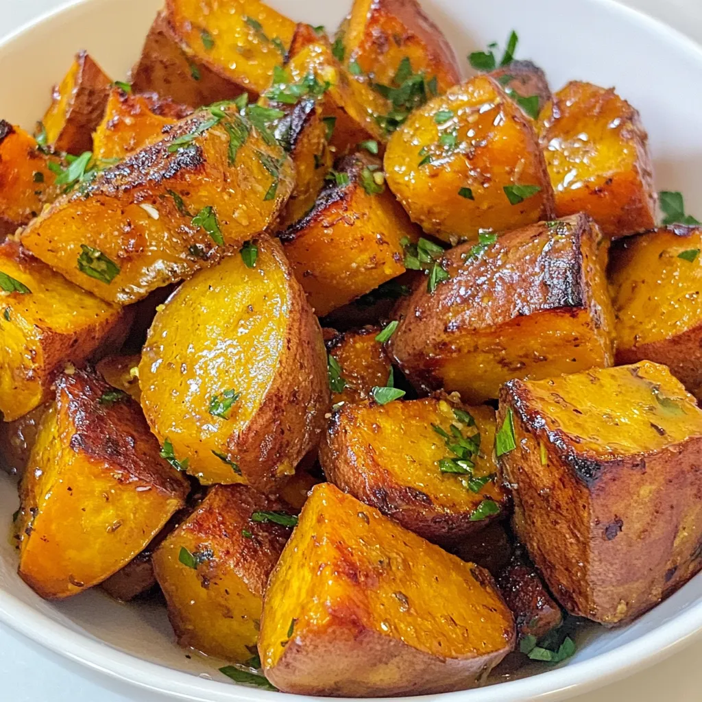 Just before serving, generously sprinkle freshly chopped parsley over the warm sweet potatoes to add a pop of color and freshness.