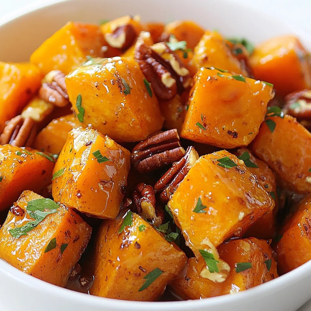 To make maple pecan roasted sweet potatoes, you need a few simple ingredients. Each one adds flavor and texture to the dish. - 4 medium sweet potatoes, peeled and diced into 1-inch cubes - 1/4 cup pure maple syrup - 1/4 cup pecans, roughly chopped - 2 tablespoons extra virgin olive oil - 1 teaspoon ground cinnamon - 1/2 teaspoon freshly grated nutmeg - Sea salt to taste - Fresh parsley, finely chopped (for garnish) Sweet potatoes bring a natural sweetness and a creamy texture. The maple syrup adds a rich, sweet flavor, while the pecans add crunch. Olive oil helps everything roast nicely. The spices, like cinnamon and nutmeg, create warmth and depth. Fresh parsley brightens the dish and makes it look pretty. These ingredients come together to create a dish that is not only tasty but also simple to prepare. You can find them at your local grocery store. Each ingredient plays a key role in making this dish special. Enjoy the process of gathering them! {{ingredient_image_2}} Start by preheating your oven to 425°F (220°C). Parchment paper helps keep the sweet potatoes from sticking to the pan. It also makes cleanup a breeze. Line a large baking sheet with it to prepare for roasting. Next, peel and dice the sweet potatoes into 1-inch cubes. This size helps them cook evenly. Place the diced sweet potatoes in a large bowl. Now, pour in 2 tablespoons of olive oil and 1/4 cup of pure maple syrup. Add 1 teaspoon of ground cinnamon, 1/2 teaspoon of grated nutmeg, and a pinch of sea salt. Mix everything well. Make sure each cube is coated in that sweet, spicy goodness. Spread the sweet potato mix onto your baking sheet. Keep space between the cubes for even roasting. Place the sheet in the oven and roast for 25-30 minutes. Stir the sweet potatoes halfway through. Look for a fork to easily pierce them. They should have a nice caramelized color. For the last 10 minutes, sprinkle 1/4 cup of chopped pecans over the sweet potatoes. This timing lets the pecans toast lightly. Their flavor will become richer and nuttier. Watch closely to avoid burning. Once the sweet potatoes are done, take them out of the oven. Let them cool for a couple of minutes. For a lovely finish, garnish with finely chopped parsley. This adds a fresh look and a pop of color. Enjoy your delicious maple pecan roasted sweet potatoes! To make your sweet potatoes fork-tender, cut them into even 1-inch cubes. This helps them cook at the same rate. Roasting at a high temperature, like 425°F, aids in getting that perfect texture. Stir the sweet potatoes halfway through to avoid soft spots. For caramelization, spread the cubes out on the baking sheet. Crowding them can lead to steaming instead of roasting. You can add a pinch of cayenne pepper for a little heat. Try some ground ginger for a warm twist. If you want a different crunch, swap in walnuts or almonds for the pecans. Each nut brings a unique flavor that can change the dish's profile. For special occasions, serve the sweet potatoes in a colorful bowl. Drizzle extra maple syrup on top for a shiny finish. Adding whole pecans or a sprinkle of fresh parsley makes the dish pop. These little touches will impress your guests and make your meal look stunning! Pro Tips Use Fresh Spices: Freshly grated nutmeg and ground cinnamon will enhance the flavors of your dish significantly compared to pre-ground spices. Check for Doneness: Sweet potatoes can vary in size; check for doneness with a fork to ensure they are tender throughout. Customize the Nuts: Feel free to swap out pecans for walnuts or almonds for a different flavor profile. Storage Tips: Leftover roasted sweet potatoes can be stored in an airtight container in the fridge for up to 3 days and reheated for a quick side dish. {{image_4}} You can use different types of sweet potatoes for this dish. You might try Japanese sweet potatoes. They have a creamy texture and a sweet taste. Another option is purple sweet potatoes. They add color and unique flavor. If you want to mix it up, consider adding other root vegetables. Carrots or butternut squash work well. They roast nicely and pair well with maple syrup. If you want a different flavor, try using other sweeteners. Honey or agave syrup can replace maple syrup. Each has its own taste but will still make your dish sweet. You can also explore different nuts. Walnuts or almonds can add a nice crunch. Each nut will give a new twist to the original recipe. For a vegan twist, skip the butter and use olive oil. This keeps the recipe dairy-free. You can also use coconut milk instead of any cream. It adds a subtle sweetness and creaminess. If you want to add some richness, try a vegan butter substitute. This keeps the dish light but tasty. To store leftovers of your maple pecan roasted sweet potatoes, let them cool first. Place them in an airtight container. This helps keep the flavors fresh. I recommend using glass containers for best results. They do not absorb odors and are easy to clean. These sweet potatoes can stay in the fridge for about three to four days. When it's time to eat leftovers, reheating them is simple. The best methods are using an oven or a microwave. If using an oven, preheat it to 350°F (175°C) and place the sweet potatoes on a baking sheet. Bake for about 10-15 minutes. This method keeps the texture crispy. If you use a microwave, heat in short bursts of 30 seconds. Stir between each burst to avoid uneven heating. You can also freeze roasted sweet potatoes. To freeze, let them cool completely before placing them in a freezer-safe bag. Try to remove as much air as possible. They can last up to three months in the freezer. When ready to eat, thaw overnight in the fridge. For reheating, use the oven for the best texture. Heat at 350°F (175°C) for about 20-25 minutes until warm. Yes, you can make this recipe ahead. To prepare, roast the sweet potatoes and let them cool. Store them in an airtight container in the fridge. You can keep them for up to three days. When ready to 