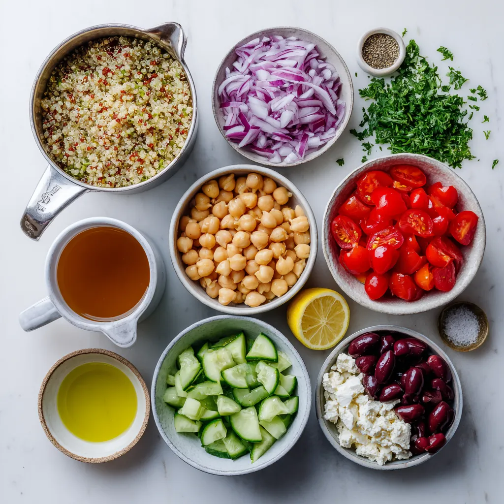 Quinoa is the star of this dish. It cooks up fluffy and has a mild taste. The fresh vegetables add crunch and color. Cherry tomatoes burst with flavor, while cucumbers keep things refreshing. Red bell peppers bring sweetness. The red onion adds a little bite. Chickpeas give protein and a nice texture. Kalamata olives add a salty, briny flavor. Feta cheese crumbles beautifully, adding creaminess. Fresh parsley brightens the dish and adds a herbal note.