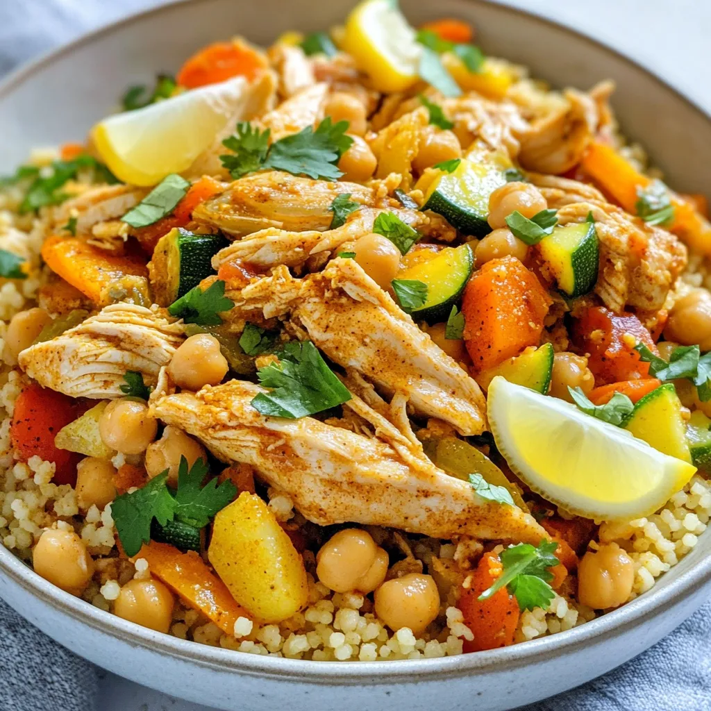 When serving, create a bed of fluffy couscous on each plate. Spoon the chicken and vegetable mix over the couscous. Garnish with fresh chopped cilantro and add lemon wedges on the side. This adds a fresh zing to your dish.