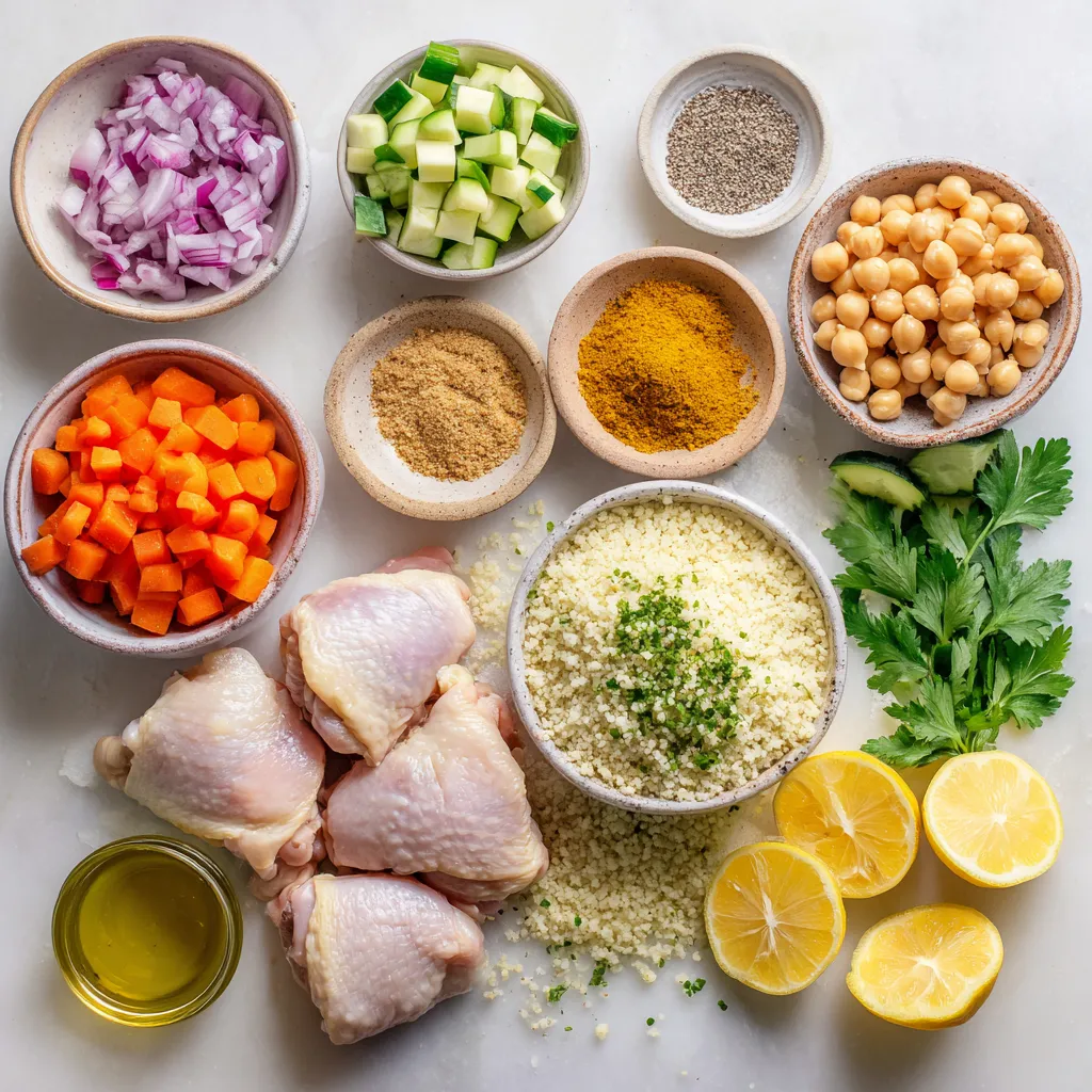A flavorful dish featuring tender chicken thighs, couscous, and a medley of vegetables, seasoned with aromatic spices.