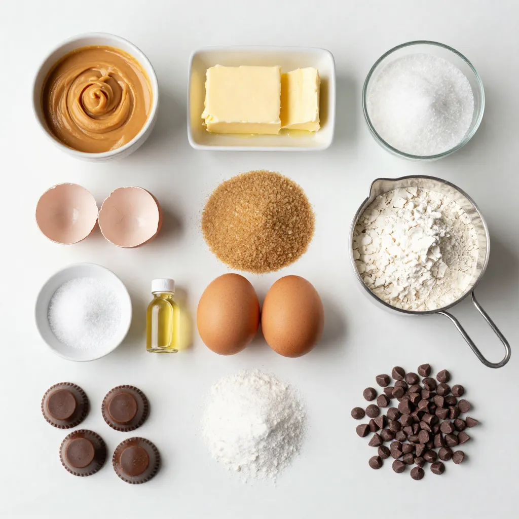 - 1 cup creamy peanut butter - 1/2 cup unsalted butter, melted - 1 cup packed brown sugar - 1/2 cup granulated sugar - 2 large eggs - 1 teaspoon pure vanilla extract - 1 1/2 cups all-purpose flour - 1/2 teaspoon baking powder - 1/4 teaspoon salt - 1 cup mini chocolate peanut butter cups, chopped (plus extra for topping) - 1/2 cup chocolate chips (optional) You can add chocolate chips for more chocolatey goodness. Consider using sea salt for a sweet-savory taste. A dash of cinnamon can add warmth. You might also try some chopped nuts for extra crunch. If you need a dairy-free option, use a plant-based butter. Almond flour works well instead of all-purpose flour for gluten-free blondies. You can replace peanut butter with almond butter for a different flavor. If you want less sugar, use coconut sugar instead. {{ingredient_image_2}} Start by preheating your oven to 350°F (175°C). Next, grab a 9x9-inch baking pan. You can lightly grease it or line it with parchment paper. This makes removing the blondies easy when they are done. In a large bowl, combine 1 cup of creamy peanut butter with 1/2 cup of melted unsalted butter. Mix these until they are smooth and well blended. Next, add 1 cup of packed brown sugar and 1/2 cup of granulated sugar. Mix again until the texture is creamy. Then, add 2 large eggs, one at a time. Beat well after each egg. Finally, stir in 1 teaspoon of pure vanilla extract for extra flavor. In another bowl, whisk together 1 1/2 cups of all-purpose flour, 1/2 teaspoon of baking powder, and 1/4 teaspoon of salt. This helps distribute the baking powder evenly. Gradually fold the dry mixture into your wet mixture. Mix gently until just combined. Be careful not to overmix. This keeps the blondies soft. Now, add 1 cup of chopped mini chocolate peanut butter cups and 1/2 cup of chocolate chips if you like. Fold them into the batter. Pour the batter into your prepared baking pan. Spread it evenly. For a fun touch, sprinkle extra chopped peanut butter cups on top. Place the pan in the oven and bake for 25-30 minutes. The blondies will be golden brown. A toothpick should come out mostly clean with a few moist crumbs. After baking, let the blondies cool in the pan for about 10-15 minutes. Use the parchment paper to lift them out and cool completely on a wire rack. Once cool, cut them into squares. For a nice finish, dust with powdered sugar or drizzle melted chocolate on top before serving. Enjoy every delicious bite! To make the best peanut butter cup blondies, follow these key tips: - Use room temperature ingredients. This helps everything blend smoothly. - Do not overmix the batter. Mix until just combined for soft blondies. - Check your oven temperature. Ovens can vary. An oven thermometer can help. Avoid these common pitfalls: - Skipping the parchment paper. This makes removal hard and can ruin your blondies. - Overbaking. Check them early. They should be golden and moist in the center. - Not cooling before cutting. Let them cool fully to prevent crumbling. For chewy blondies: - Use more brown sugar and less flour. - Bake for a shorter time. For cake-like blondies: - Increase the flour slightly. - Add more eggs for a fluffier texture. Experiment with these tips to find your perfect blondie! Pro Tips Use Room Temperature Ingredients: Let your butter and eggs come to room temperature before mixing. This will help achieve a smoother batter and better texture in your blondies. Don’t Overmix: When combining the wet and dry ingredients, mix just until combined. Overmixing can lead to dense blondies instead of the desired soft and chewy texture. Customize Your Mix-ins: Feel free to experiment with different types of chocolate or add nuts for a crunchy texture. Chopped pretzels or toffee bits could add a delightful twist! Check for Doneness: Start checking your blondies a few minutes before the recommended baking time. They should be golden brown, and a toothpick inserted should come out with a few moist crumbs. {{image_4}} You can easily make gluten-free peanut butter cup blondies. Just swap the all-purpose flour for a gluten-free flour blend. Make sure it contains xanthan gum, which helps with texture. This swap keeps the blondies soft and chewy. Mix-ins can add fun flavors to your blondies. Try adding chopped nuts like pecans or walnuts for crunch. You can also add dried fruits like cranberries or cherries for a sweet touch. Just remember to keep the total mix-ins around one cup for the best texture. To make vegan peanut butter cup blondies, replace eggs with flax eggs. For each egg, mix one tablespoon of flaxseed meal with three tablespoons of water. Let it sit until it thickens. Use a plant-based butter or coconut oil instead of regular butter. These swaps keep the blondies delicious and plant-based. Store your leftover blondies in an airtight container. Keep them at room temperature for up to three days. If you want to keep them longer, move them to the fridge. They can last up to a week in the fridge. Make sure to let them cool completely before storing. This keeps them soft and fresh. You can freeze these blondies for later. First, cut them into squares. Wrap each square in plastic wrap. Then, place them in a freezer-safe bag. They can stay frozen for up to three months. When you are ready to eat them, just take out the number you want. To reheat your blondies, use the microwave or oven. If using a microwave, heat for 10-15 seconds. Check if they are warm enough. If you use the oven, preheat it to 350°F (175°C) and heat for about 5-10 minutes. This will help restore their soft texture. Enjoy your warm blondies with a scoop of ice cream or a drizzle of chocolate! Blondies and brownies are both delicious baked treats. The main difference is in their base. Blondies use brown sugar and butter, while brownies use cocoa powder. This makes blondies taste sweet and buttery. Brownies have a rich chocolate flavor. Both are soft and chewy, but they offer different tastes and colors