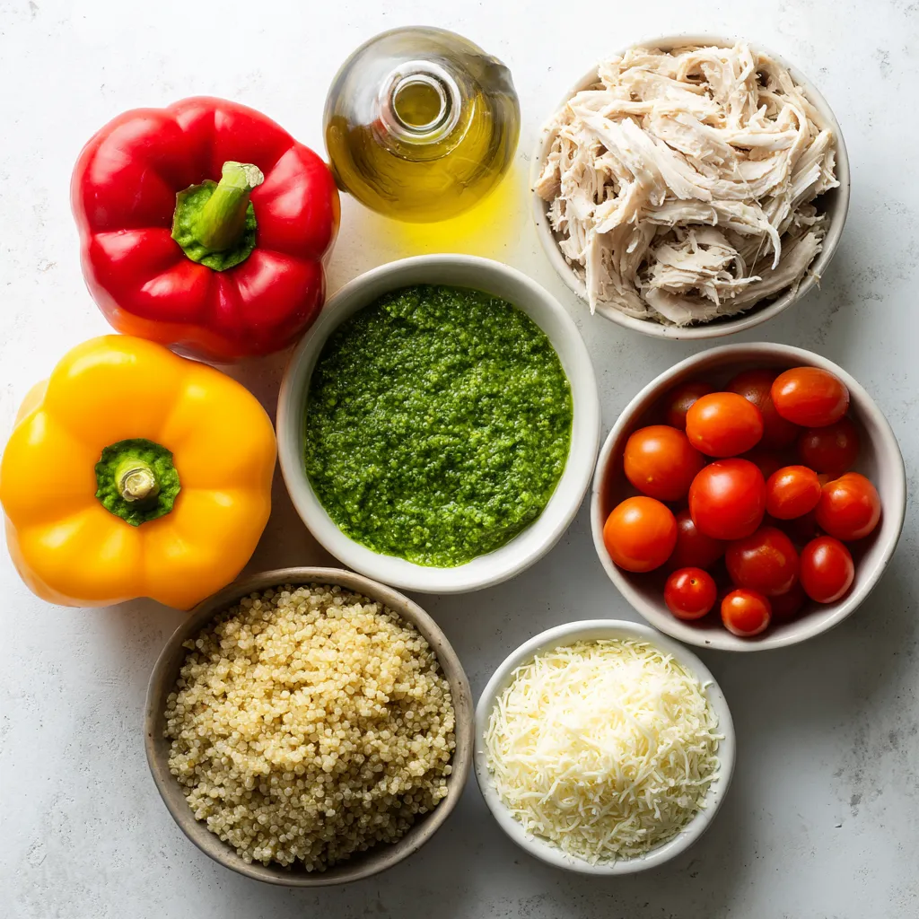 Choosing the right bell peppers makes a big difference. I like to pick colorful ones, like red, yellow, and green. They add fun to the dish and a burst of flavor. For the chicken, you can use rotisserie chicken to save time. Fresh basil pesto gives the best taste, but store-bought works too. Quinoa or rice acts as a great base, adding texture and nutrients. Cherry tomatoes bring freshness and sweetness. Mozzarella and parmesan cheese make everything creamy and delicious. Don’t forget to season with salt and pepper for that perfect taste. Finally, a drizzle of olive oil helps the peppers cook well and adds flavor.