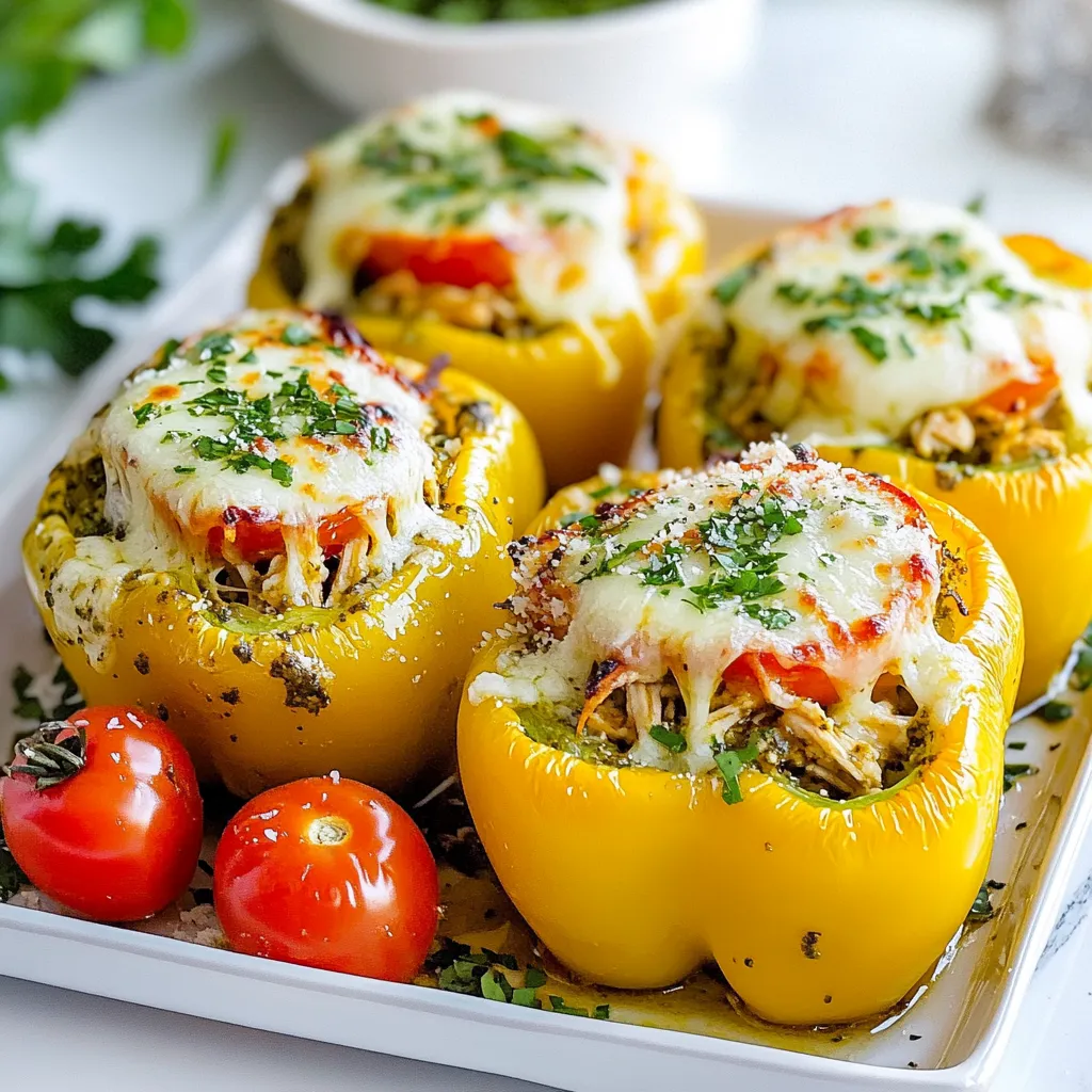 A vibrant and flavorful dish featuring bell peppers stuffed with a delicious mixture of chicken, pesto, quinoa, and cheese.