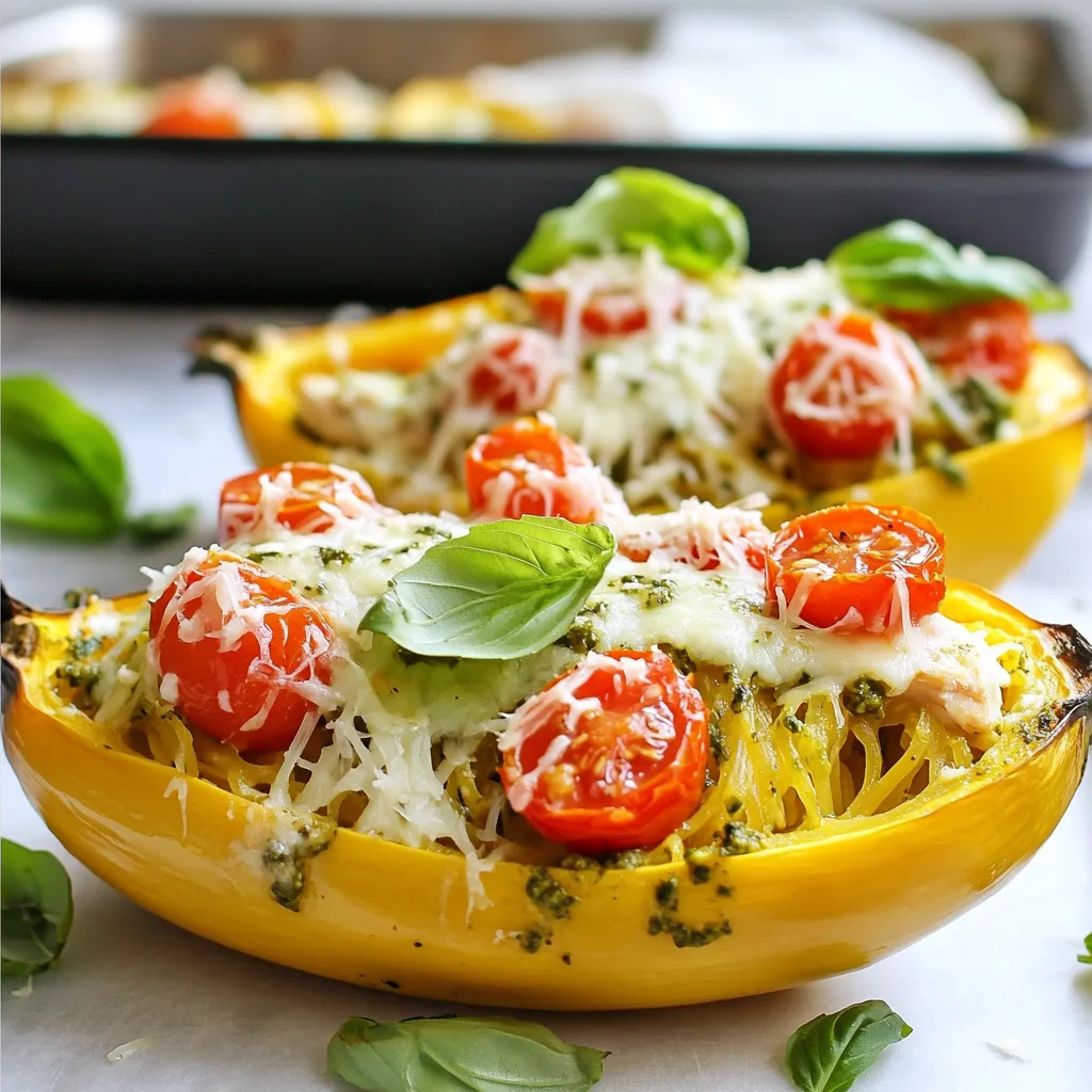 A delicious and healthy dish featuring spaghetti squash filled with shredded chicken and basil pesto.