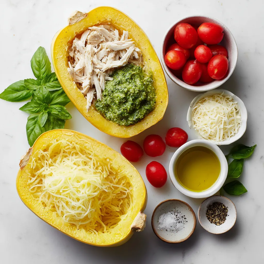 Gather these ingredients for a delicious meal. The spaghetti squash serves as a tasty base. Shredded chicken adds protein and pairs well with basil pesto. Cherry tomatoes add freshness, while mozzarella and Parmesan bring creaminess. Olive oil, salt, and pepper enhance the flavors. Fresh basil leaves provide a lovely touch before serving.