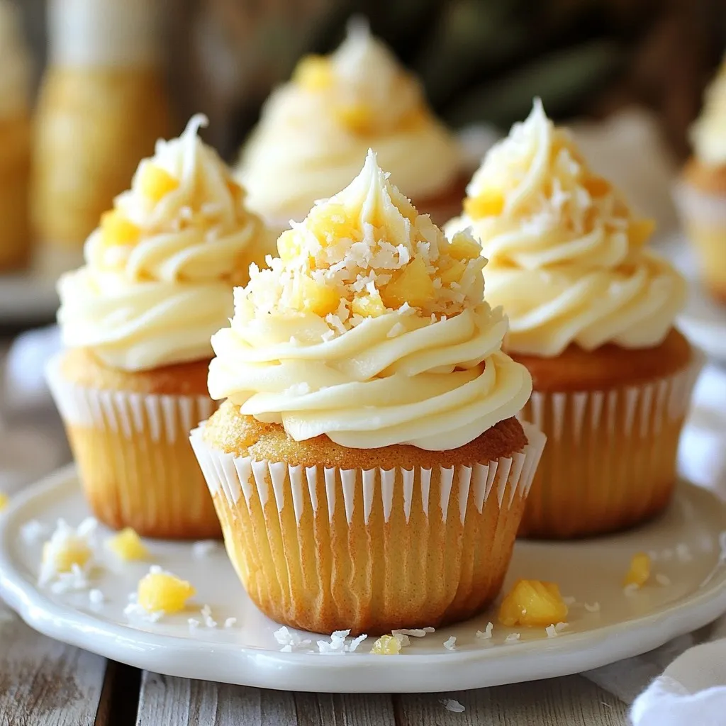 Deliciously moist cupcakes infused with pineapple and coconut flavors, perfect for any occasion.