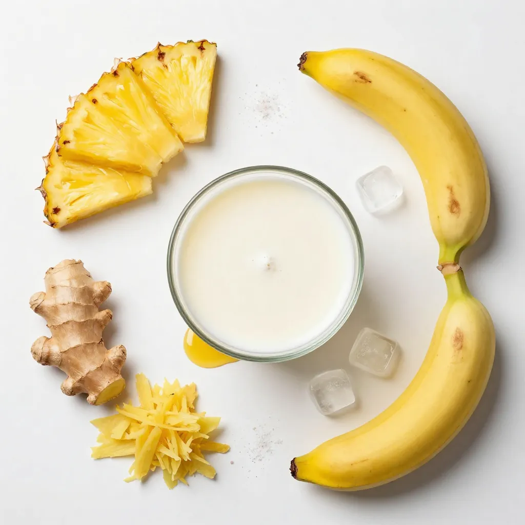 Fresh pineapple chunks are the star of this smoothie. They add a sweet and tangy flavor. Use one cup of chilled pineapple for the best taste. The colder it is, the more refreshing your drink will be. A ripe banana brings creaminess to the smoothie. Slice one banana before adding it to the mix. This fruit also adds natural sweetness. It pairs well with the pineapple for a smooth blend. Fresh ginger adds a delightful zing to this drink. You need half a teaspoon of finely grated ginger. This ingredient gives your smoothie a unique and spicy kick. It also has many health benefits, making your drink even better. {{ingredient_image_2}} First, gather your ingredients. You will need: - 1 cup fresh pineapple chunks, preferably chilled - 1 ripe banana, sliced - ½ teaspoon fresh ginger, finely grated - 1 cup coconut milk (or your preferred milk alternative) - 1 tablespoon honey or maple syrup (optional, to taste) - ½ cup ice cubes - A pinch of salt Start by cutting the pineapple into chunks. Make sure they are sweet and juicy. Next, slice the banana into small pieces. Then, grate the ginger finely. This will help release its flavor. Gather all these fresh ingredients on your counter for easy access. Now, it’s time to blend! Add the pineapple chunks, banana slices, and ginger into the blender. Pour in the coconut milk next. This gives the smoothie a creamy texture. If you like your smoothie a bit sweeter, add honey or maple syrup now. Next, toss in the ice cubes and add a pinch of salt. The salt will make the flavors pop. Blend the mixture on high speed until it is smooth and creamy. Make sure there are no lumps left. This ensures every sip is delicious! After blending, taste your smoothie. If it’s not sweet enough for your liking, you can add more honey or maple syrup. Blend again briefly to mix in the extra sweetness. This gives you a chance to get the flavor just right. Once you’re happy with the taste, pour the smoothie into chilled glasses. Enjoy your refreshing and healthy drink right away! To get the best texture, start with chilled ingredients. I love using fresh pineapple and a ripe banana. This makes the smoothie creamy and smooth. When blending, ensure you mix on high speed. Blend until there are no lumps left. If your smoothie is too thick, add more coconut milk. For a thinner smoothie, just add more ice cubes. If you have leftover smoothie, store it in an airtight container. This keeps the smoothie fresh longer. Place it in the fridge and drink it within 24 hours. The smoothie may separate, so give it a good shake before drinking. I prefer to make just enough for one sitting. This way, I enjoy it at its best! Serve your smoothie in chilled glasses for a fun touch. You can also garnish it with fresh pineapple or a slice of banana. This adds a nice look and extra flavor. For a tropical twist, try adding a sprinkle of coconut flakes on top. Enjoy it as a quick breakfast or a refreshing snack! Pro Tips Choose Ripe Ingredients: Using ripe and fresh pineapple and banana ensures the best flavor and natural sweetness in your smoothie. Experiment with Milk Alternatives: Coconut milk adds a tropical flavor, but feel free to use almond, oat, or soy milk for different tastes and textures. Adjust Sweetness to Your Liking: Taste your smoothie after blending and adjust the sweetness with honey or maple syrup based on your preference. Chill Your Ingredients: For an extra refreshing drink, chill your fruits and coconut milk beforehand, or serve the smoothie in chilled glasses. {{image_4}} You can change the flavor of your smoothie by adding other fruits. Try mango or papaya for a tropical twist. You can also mix in some berries like strawberries or blueberries for a burst of color and taste. Each fruit brings its own fun flavor and health benefits. If you want a dairy-free smoothie, use plant-based milk. Coconut milk works best for this recipe. Almond or oat milk are also great choices. They add creaminess without dairy. You can also skip the milk and use fruit juice for a lighter drink. To kick up the flavor, consider adding a squeeze of lime or lemon juice. This gives a zesty kick that pairs well with pineapple. You can also sprinkle in some cinnamon or nutmeg for warmth. For an extra health boost, add a handful of spinach or kale. This adds nutrition without changing the taste much. You can store your pineapple ginger smoothie in the fridge. Use an airtight container. It stays fresh for up to 24 hours. The taste and texture might change slightly over time. Shake or stir before drinking to mix it well again. Freezing is a great way to keep your smoothie longer. Pour the smoothie into ice cube trays or freezer-safe bags. This method allows you to thaw only what you need. It can last up to three months in the freezer. When ready to enjoy, blend the frozen cubes with a splash of milk for a quick treat. To keep your smoothie fresh, always use ripe ingredients. Fresh fruit provides the best flavor. Use chilled ingredients to enhance the refreshing taste. If you make a larger batch, separate it into portions. This method helps maintain its taste and texture for each serving. Yes, you can use frozen pineapple. It makes the smoothie cold and thick. Frozen pineapple is easy to find and saves time. If you use frozen pineapple, skip the ice cubes. This keeps the smoothie from being too icy. A smooth texture is key to a great drink. Ginger is great for your health. It helps with digestion and can ease nausea. Ginger also has anti-inflammatory properties. This means it can help reduce swelling and pain. Adding ginger to your smoothie gives flavor and boosts your immune system. It can also give you a nice energy lift. You can make a smoothie without a blender using a few tools. First, use a fork or a potato masher to mash the fruit. This works best with ripe bananas and soft pineapple. Next, mix in coconut milk and ginger using a whisk. If you want a smoother drink, you can use a jar and shake it well. This