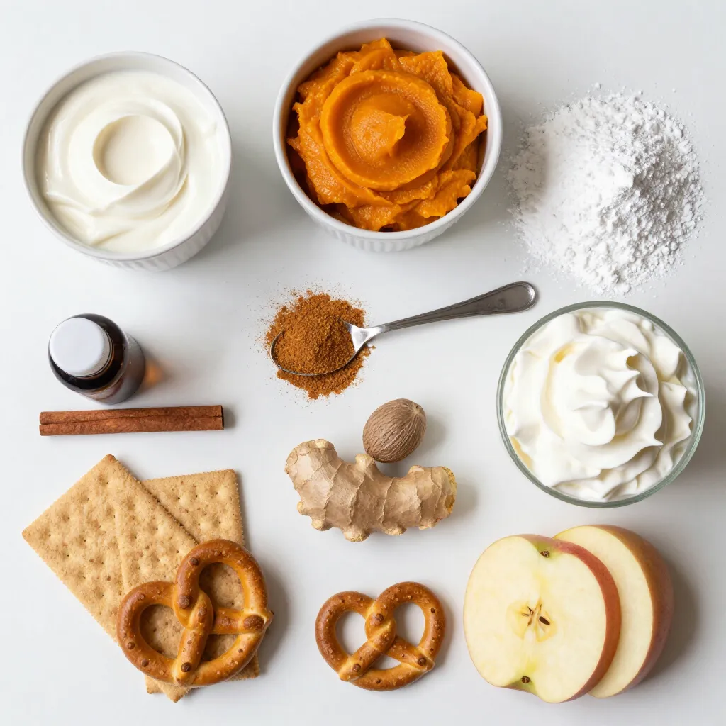To start, we need cream cheese. Use one cup. It gives the dip its smooth base. Next, grab a cup of canned pumpkin puree. This adds flavor and a nice orange color. Then, we have half a cup of powdered sugar for sweetness. We also need one teaspoon of pure vanilla extract. This brings a lovely aroma. Lastly, add one teaspoon of ground cinnamon for warmth.