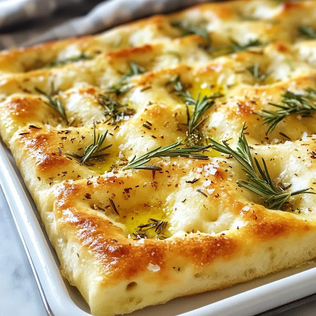 - 4 cups all-purpose flour - 2 teaspoons sea salt - 1 packet (2¼ teaspoons) instant yeast - 1¾ cups warm water (approximately 110°F) - ¼ cup olive oil (plus extra for drizzling) - 2 tablespoons fresh rosemary, finely chopped - Flaky sea salt for garnishing Focaccia is a delightful treat. Each serving has about 150 calories. It also offers 1 gram of fiber. This bread is low in fat and has no added sugars. The olive oil gives it healthy fats. Rosemary adds flavor and aroma, making every bite special. Eating focaccia can be a great way to enjoy fresh bread. You can serve it with dips or use it for sandwiches. Plus, making it at home means you know exactly what goes into it. Enjoy this tasty treat while knowing it's made with love! {{ingredient_image_2}} 1. Start with a large bowl. Add 4 cups of all-purpose flour, 2 teaspoons of sea salt, and 1 packet of instant yeast. Use a whisk to mix them well. 2. Gradually pour in 1¾ cups of warm water and ¼ cup of olive oil. Stir with a wooden spoon until you see a sticky dough form. 1. Lightly flour your hands. Knead the dough in the bowl for 5 minutes. This helps the dough become elastic. If it feels too sticky, add a little more flour. 2. Cover the bowl with a damp towel. Put it in a warm spot. Let the dough rise for about 1 hour or until it doubles in size. 1. Preheat your oven to 425°F (220°C). 2. Once the dough has risen, gently punch it down. Transfer the dough to an oiled baking sheet. 3. Use your fingers to stretch the dough. Make dimples across the surface for texture. 4. Drizzle olive oil on top, filling the dimples. Sprinkle chopped rosemary and flaky sea salt evenly over the dough. 5. Let the dough rest for another 20 minutes. This allows it to puff up slightly. 6. Bake for 20-25 minutes. Look for a golden brown top. 7. After baking, let the focaccia cool for a few minutes before slicing. Optionally, drizzle more olive oil on top for extra flavor. To make focaccia with a great texture, start by kneading the dough well. Knead it for about 5 minutes. If the dough sticks to your hands, add a bit more flour. This helps the dough become smooth and stretchy. Let the dough rise in a warm spot. Cover it with a damp towel. It should double in size in about an hour. If your dough does not rise, check that your yeast is fresh. Old yeast can lead to flat bread. If your bread feels too dense after baking, it might not have risen enough. Next time, give it more time to rise. You can enhance the flavor of your focaccia with fun toppings. Try adding sliced olives or sun-dried tomatoes. You can also sprinkle in some grated cheese before baking for a savory twist. For extra flavor, consider adding spices. A pinch of garlic powder or crushed red pepper flakes can add a nice kick. Fresh herbs like thyme or basil also work well if you want to change it up. Experiment with different flavors to find your perfect focaccia! Pro Tips Use Fresh Rosemary: For the best flavor, always use fresh rosemary instead of dried. It adds a vibrant aroma and taste to your focaccia. Proper Dough Consistency: The dough should be sticky but manageable. If it’s too wet, add a little flour, but avoid making it too dry. Punching Down the Dough: Don't skip the punching step! It helps to redistribute the yeast and creates a better texture in the final product. Golden Brown Finish: Keep an eye on the focaccia as it bakes. A golden brown top indicates it's perfectly baked and will have a delicious crust. {{image_4}} You can change up the herbs in focaccia. If you want a twist, try thyme or oregano. Both herbs add unique flavors. Dried herbs work well too, but fresh herbs give a brighter taste. I recommend using about one tablespoon of dried herbs for each two tablespoons of fresh. Adding cheese or olives can enhance the flavor of your focaccia. Try mixing in crumbled feta or sliced olives before baking. This adds a savory touch. You can also change the type of flour for different tastes. For a nuttier flavor, use whole wheat flour. It gives the bread a lovely texture. You can mix half all-purpose flour with half whole wheat for a balanced result. To keep your focaccia fresh, you have two main options: room temperature or refrigeration. If you plan to eat it within a day or two, store it at room temperature. Wrap the focaccia in paper. This keeps it soft and prevents it from getting soggy. If you want to keep it longer, store it in the fridge. Use plastic wrap for this method. However, know that refrigeration can change the texture. When reheating focaccia, the oven is your best friend. Preheat your oven to 350°F (175°C). Place the focaccia directly on the rack for about 5–10 minutes. This helps revive that crispy crust and soft inside. You can also use a skillet. Heat it over medium heat. Add a little olive oil and place the focaccia in the pan. Cover it with a lid. This method keeps the focaccia moist while crisping the bottom. For both methods, avoid using a microwave. It makes the focaccia chewy. Enjoy that fresh-baked taste again! Signs of undercooking include a wet or doughy center. The crust may not be golden brown. If you see these signs, it is clear that your focaccia needs more time in the oven. For next time, check the baking time closely. Use a toothpick to test the center of the bread. If it comes out clean, the bread is done. Also, ensure your oven is at the right temperature. An oven thermometer can help with accuracy. Yes, you can make focaccia ahead of time. Prepare the dough and let it rise. After the first rise, you can cover it and store it in the fridge. It will keep well for about 24 hours. When ready to bake, take it out and let it come to room temperature. This may take about 30 minutes. You can then shape it and let it rise again before baking. This method adds a nice flavor as well. Focaccia is best served warm. You can cut it into squares or strips. Pair it with a small bowl of olive oil for dipping. Consider adding balsamic vinegar to the olive oil
