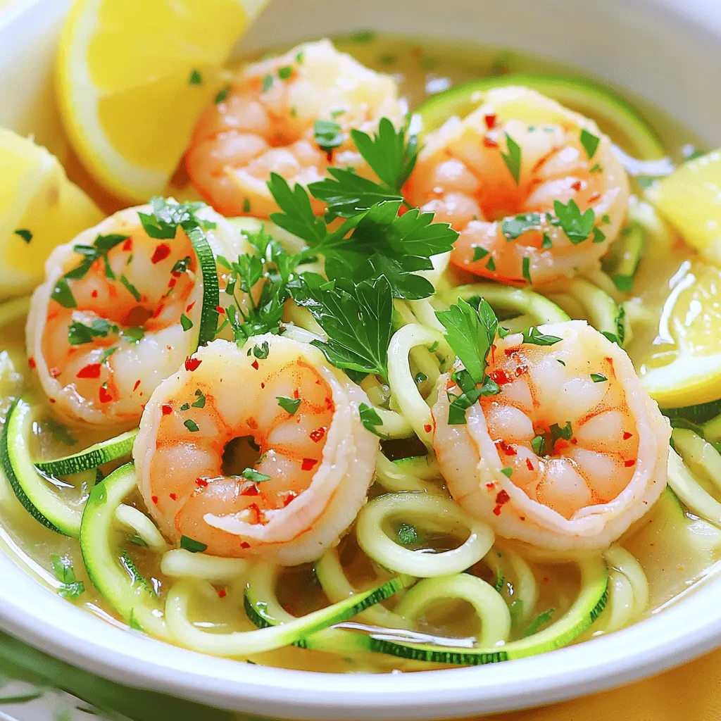 - Zucchini and Shrimp Requirements - 2 medium zucchinis, spiralized into zoodles - 1 pound large shrimp, peeled and deveined - Flavor Enhancers - 4 cloves garlic, finely minced - 1/4 cup chicken or vegetable broth - 2 tablespoons extra virgin olive oil - 2 tablespoons fresh lemon juice - 1/4 teaspoon red pepper flakes (adjust for heat preference) - Seasoning and Garnish - Salt and freshly ground black pepper, to taste - Fresh parsley, finely chopped (for garnish) - Lemon wedges (for serving) Gathering these ingredients sets you up for success. Zoodles give a fresh base, while shrimp adds protein. Garlic and broth create a rich flavor. Olive oil adds healthy fat, and lemon juice brings brightness. Red pepper flakes offer a little kick, enhancing the dish's depth. Fresh parsley and lemon wedges provide a lovely finish. This mix makes your shrimp scampi zoodles both tasty and healthy. - Spiralizing the Zucchini To start, take two medium zucchinis. Use a spiralizer to turn them into zoodles. If you don’t have a spiralizer, a vegetable peeler works too. Just make thin, long strips. This creates a fun, noodle-like dish. - Setting the Zoodles Aside Once you finish spiralizing, place the zoodles in a bowl. Set them aside while you cook the shrimp. This keeps them fresh and ready for later. - Heating Oil and Sautéing Garlic Grab a large skillet and heat two tablespoons of extra virgin olive oil over medium heat. Add four minced garlic cloves and a pinch of red pepper flakes. Sauté this mix for about one minute. You want the garlic to be fragrant but not burnt. - Cooking the Shrimp Now, raise the heat to medium-high. Add one pound of peeled and deveined shrimp to the skillet. Cook each side for about two to three minutes. The shrimp should turn pink and opaque. Add salt and black pepper to taste while cooking. - Adding Broth and Lemon Juice Once the shrimp are cooked, take them out and set them on a plate. In the same skillet, pour in a quarter cup of chicken or vegetable broth. Use a wooden spoon to scrape any tasty bits stuck on the bottom. Then, stir in two tablespoons of fresh lemon juice. Let this mixture simmer gently. - Incorporating Zoodles and Shrimp Now, add the zoodles to the skillet. Toss them in the broth to coat well. Cook the zoodles for three to four minutes. They should be tender but still have a nice crunch. Finally, return the shrimp to the skillet. Gently mix everything together. Heat for one to two more minutes. Adjust the seasoning with salt, pepper, or more lemon juice as needed. This method leads to a delightful dish that's flavorful and healthy. Enjoy the process and the tasty results! - Ensuring Perfectly Cooked Shrimp To cook shrimp perfectly, start with fresh shrimp. Heat your olive oil until it shimmers. Add the shrimp in a single layer. Cook for 2-3 minutes per side. They should turn pink and opaque. Don’t crowd the pan; this helps them cook evenly. Remove them as soon as they are done. - Avoiding Overcooked Zoodles Zoodles cook fast. To keep them crisp, only sauté them for 3-4 minutes. Add them to the skillet after the broth and lemon juice. Toss gently, ensuring they are coated but not overcooked. Taste them; they should be tender yet have a slight bite. - Presentation Tips For a beautiful presentation, serve the dish in a large, shallow bowl. Lay the zoodles first, then top with shrimp. Sprinkle fresh parsley on top for color. Add lemon wedges on the side. This lets everyone add a fresh squeeze of lemon. - Pairing Options Pair shrimp scampi zoodles with a light salad. A mixed green salad with a vinaigrette works well. You could also serve garlic bread on the side for a classic touch. A crisp white wine will complement the dish beautifully. {{image_4}} You can swap shrimp for chicken or tofu. Both options give a nice taste. Chicken works well and cooks quickly. Tofu adds a protein boost and is great for vegans. Just cut it into cubes and cook until golden. Zoodles are fun, but try other veggies too! Carrots, squash, or bell peppers make great zoodle swaps. Use a spiralizer or julienne peeler for fun shapes. This keeps your dish colorful and adds nutrients. Cheese can add creaminess to your dish. Try Parmesan or feta for a salty kick. Add it just before serving, so it melts slightly. This makes each bite rich and savory. Adjust the seasonings to match your taste. Add herbs like basil or oregano for freshness. You can also try different spices, like paprika for warmth. Just a dash of each can change the dish completely. How to Store Leftovers To keep your shrimp scampi zoodles fresh, store them in an airtight container. Make sure the zoodles and shrimp cool down before sealing the container. This helps prevent excess moisture. You can add a paper towel inside the lid to soak up any extra liquid. Shelf Life When stored correctly, shrimp scampi zoodles can last in the fridge for up to 3 days. After that, the zoodles may become too soggy. Always check for off smells or changes in texture before eating leftovers. Best Ways to Reheat Zoodles The best way to reheat zoodles is in a skillet over medium heat. Add a splash of broth or olive oil to keep them moist. Stir gently until heated through. This method helps maintain their crispness. Avoiding Overcooking To avoid overcooking zoodles, heat them just until warm. Cook for about 2-3 minutes. If you heat them too long, they can become mushy. Keep an eye on them for the best results. What are zoodles? Zoodles are noodles made from zucchini. I use a spiralizer to turn zucchini into long, fun shapes. They are a great substitute for pasta. Zoodles are low in carbs and calories, making them a healthy choice. Can I make this dish ahead of time? Yes, you can prepare the shrimp scampi zoodles in advance. Cook the shrimp and zoodles, then store them separately. When ready to eat, heat them in a pan. This keeps the zoodles from getting mushy. Is shrimp scampi zoodles gluten-free? Absolutely! Shrimp scampi zoodles are gluten-free