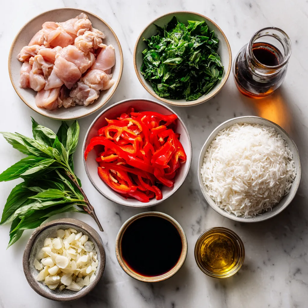 A flavorful and spicy dish featuring chicken thighs stir-fried with Thai basil, garlic, and chilies.