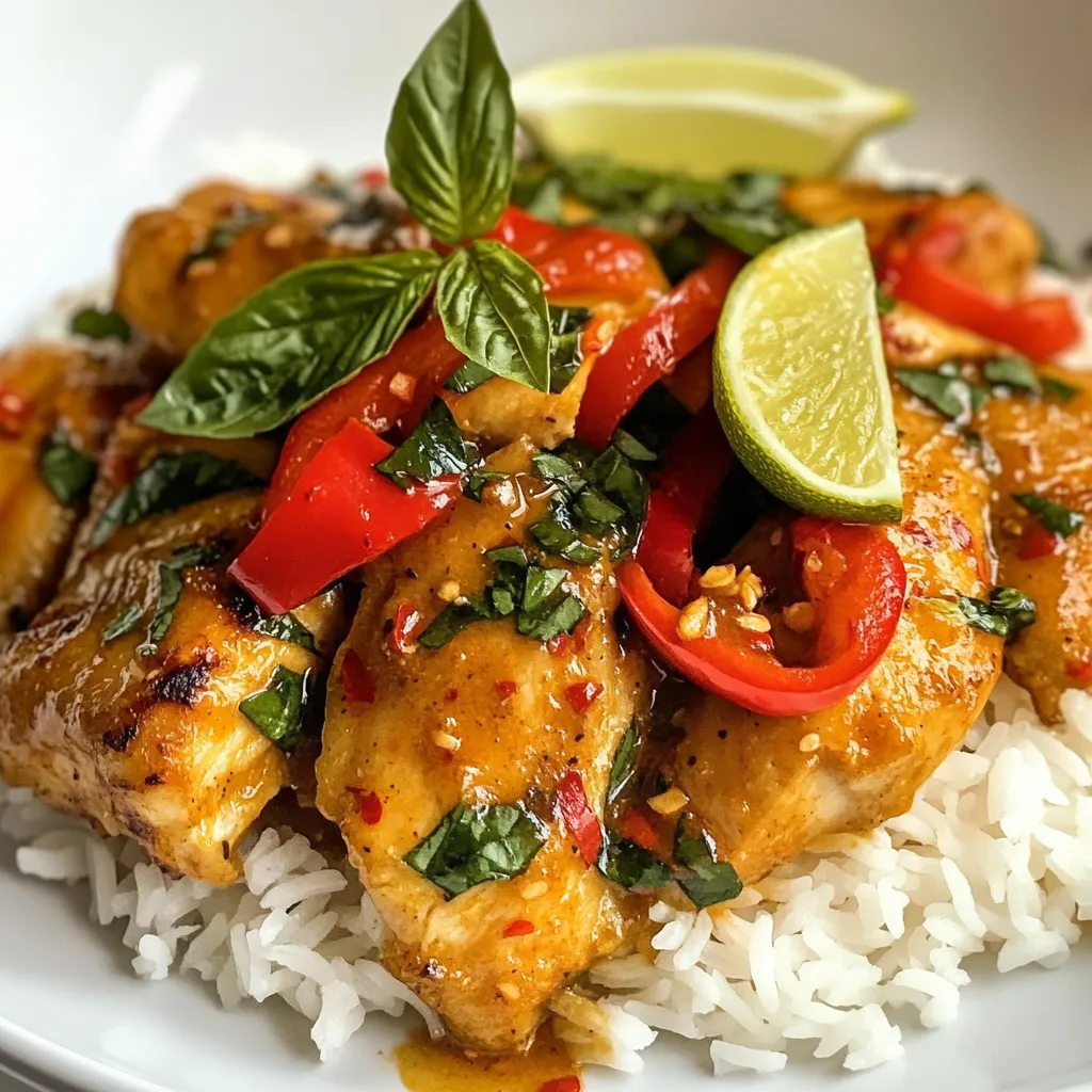 To serve, spoon the spicy Thai basil chicken over jasmine rice. For an extra touch, garnish with whole basil leaves and a slice of lime. This adds a fresh pop of flavor. Enjoy your meal!