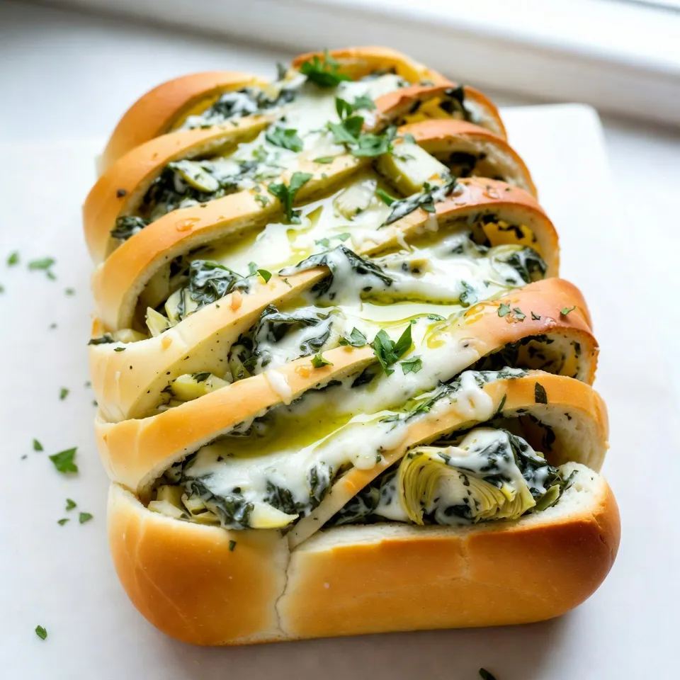 A deliciously cheesy and savory pull-apart bread filled with spinach and artichokes.