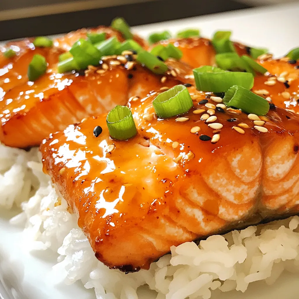 A delicious salmon dish glazed with a sweet and spicy mixture of honey and Sriracha, perfect for a flavorful meal.
