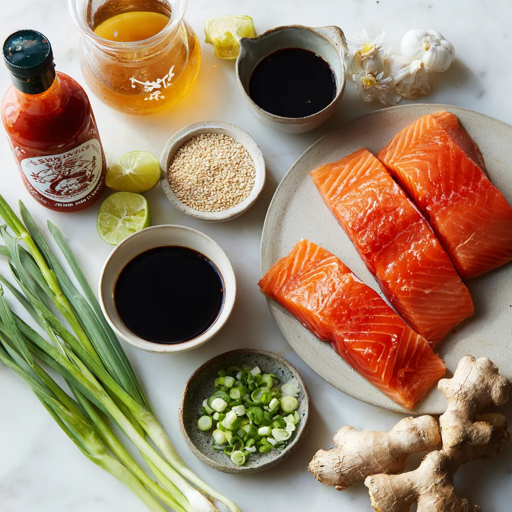 The main ingredients for Sriracha honey glazed salmon create a great mix of flavors. The salmon forms the base of your dish, while honey and Sriracha bring a sweet and spicy kick. Soy sauce adds saltiness, and ginger offers freshness. Together, they make the glaze that shines on the salmon.