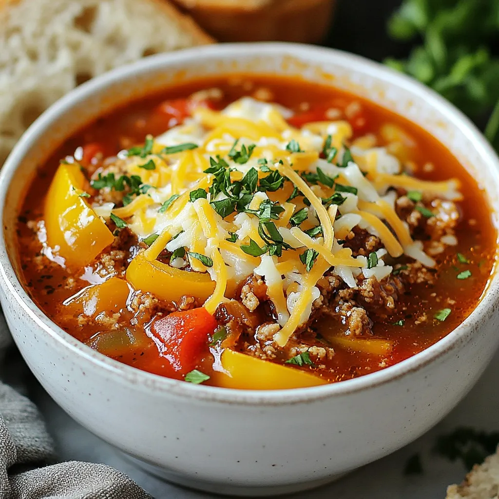 - 4 large bell peppers, chopped into bite-sized pieces - 1 pound of ground turkey or chicken - 1 can (14.5 oz) diced tomatoes, undrained - 4 cups of low-sodium chicken broth The bright colors of bell peppers bring joy to the soup. I use any color I find. Ground turkey or chicken adds protein and a hearty touch. Diced tomatoes give flavor and balance. Chicken broth creates a warm base for the dish. - 1 tablespoon of Italian seasoning - 1 teaspoon of paprika - 1 teaspoon of ground cumin - Salt and freshly ground black pepper, to taste The right spices make this soup special. Italian seasoning adds herbs and warmth. Paprika gives a slight smokiness. Ground cumin introduces a nice earthiness. I always taste and adjust with salt and pepper. - 1 cup of shredded cheese (cheddar or mozzarella) for topping - Fresh parsley, chopped for garnish Cheese makes the soup extra creamy and rich. I love using cheddar or mozzarella. A sprinkle of fresh parsley adds color and freshness. These toppings can make your soup feel gourmet! {{ingredient_image_2}} 1. Sautéing onion and garlic First, heat some olive oil in a large pot over medium heat. Add the finely diced onion. Cook for about 3-4 minutes. Wait until the onion turns soft and fragrant. Then, add the minced garlic. Stir it in and cook for another minute. This mix builds a great base for your soup. 2. Browning the meat Now, it’s time for the meat. Add 1 pound of ground turkey or chicken to the pot. Break up the meat with a spoon. Cook for about 5-7 minutes. Make sure the meat is fully browned and cooked through. This step adds depth to the soup's flavor. 1. Adding vegetables and liquids Next, toss in the chopped bell peppers. Stir them in and let them cook for 3-5 minutes. They should start to soften and brighten in color. Then, pour in the undrained diced tomatoes and chicken broth. Add the cooked brown rice, Italian seasoning, paprika, and ground cumin. Mix everything well to combine all the flavors. 2. Simmering for flavor development Increase the heat until the soup starts to boil gently. Then, reduce the heat to low and let it simmer. Allow the soup to cook undisturbed for about 20-25 minutes. This simmering melds all the flavors together, making the soup rich and hearty. 1. Seasoning to taste After simmering, taste your soup. Season it with salt and freshly ground black pepper. Adjust the seasoning until it suits your flavor preference. 2. Serving suggestions Serve the soup hot. Ladle it into bowls and top with shredded cheese. I love using cheddar or mozzarella for this. Finish with a sprinkle of chopped parsley. This adds color and a fresh taste. Enjoy the soup with some crusty bread for dipping! To ensure even cooking of the meat, break it up with a wooden spoon. This helps it cook evenly. Stir often to avoid any clumps. Cook until it is no longer pink. For the right soup consistency, let it simmer for at least 20 minutes. This helps all the flavors blend together. If the soup is too thick, add more chicken broth. If it's too thin, let it simmer longer. To boost the flavor, you can add more spices. A pinch of red pepper flakes adds heat. A dash of garlic powder gives it depth. You can also try different cheese options. Cheddar adds a sharp taste. Mozzarella gives a creamy texture. Mix them for a fun twist! For serving styles, ladle the soup into large bowls. This makes it feel hearty. Add a handful of shredded cheese on top and finish with parsley. For garnishing, consider using a swirl of sour cream. It adds a nice contrast to the colors. A sprinkle of crushed red pepper can add flair and a kick. Pro Tips Choose Colorful Peppers: Using a mix of bell pepper colors not only enhances the visual appeal of the soup but also adds a variety of flavors. Each color has its unique sweetness level! Perfectly Cooked Rice: If you're using leftover rice, ensure it's not too sticky. Fluff it up with a fork before adding it to the soup for better texture. Season Gradually: Always taste your soup as it cooks and adjust the seasoning gradually. This way, you can avoid over-salting and ensure a balanced flavor profile. Make It Ahead: This soup tastes even better the next day! Make a big batch and store leftovers in the fridge for up to three days or freeze for a quick meal later. {{image_4}} You can easily change the ingredients in stuffed pepper soup. For a vegetarian option, try using lentils or black beans. Both options provide great protein and texture. You can also swap in quinoa for rice. Quinoa adds a nutty flavor and boosts the nutrition. If you want to use a different protein, consider ground beef or pork. They will give the soup a richer taste. You can also use chicken sausage for extra flavor. Just make sure to adjust the cooking time based on the meat you choose. To spice things up, add heat with chili powder or crushed red pepper flakes. This will give your soup a nice kick. You can also try adding smoked paprika for a deeper flavor. It adds a lovely smoky note that complements the peppers. Herbs can also change the taste. Fresh basil or cilantro can brighten the soup. You can add them just before serving for a fresh burst of flavor. Oregano is another good choice to enhance the Italian seasoning. If you need a gluten-free option, use gluten-free broth and make sure all other ingredients are gluten-free. Most canned tomatoes and spices are naturally gluten-free. Check the labels to be sure. For a low-carb version, skip the rice and add more vegetables. Zucchini, cauliflower, or mushrooms work well. They will still make the soup hearty without the carbs. Just chop them small and add them when you cook the peppers. To store leftover soup, let it cool first. Then, pour it into an airtight container. Make sure to leave some space at the top. This helps the soup expand as it cools. Seal the container tightly and place it in the fridge. Your soup will stay fresh for up to three days. For freezing, use freezer-safe containers or bags. Divide the soup i