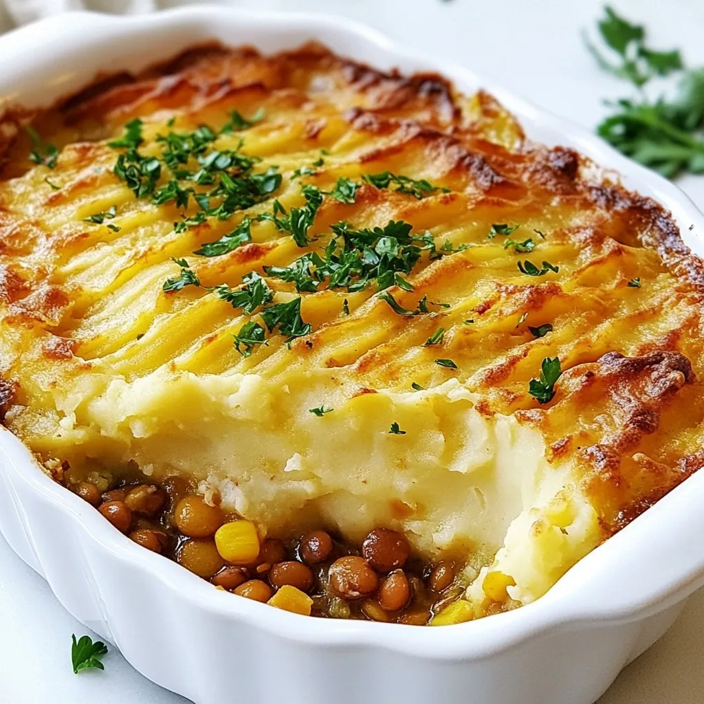 A hearty and comforting vegan twist on the classic shepherd's pie, featuring lentils and vegetables topped with creamy mashed potatoes.